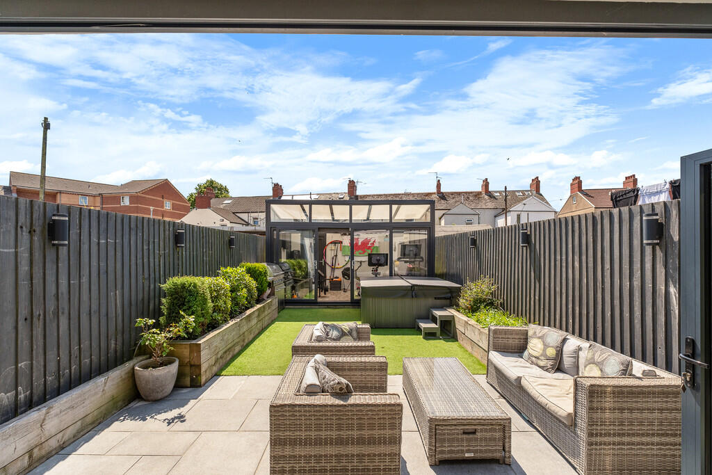 GARDEN Laid to patio. Artificial grass. Fence border. Outside tap. Wooden planters. Entrance to summer house.