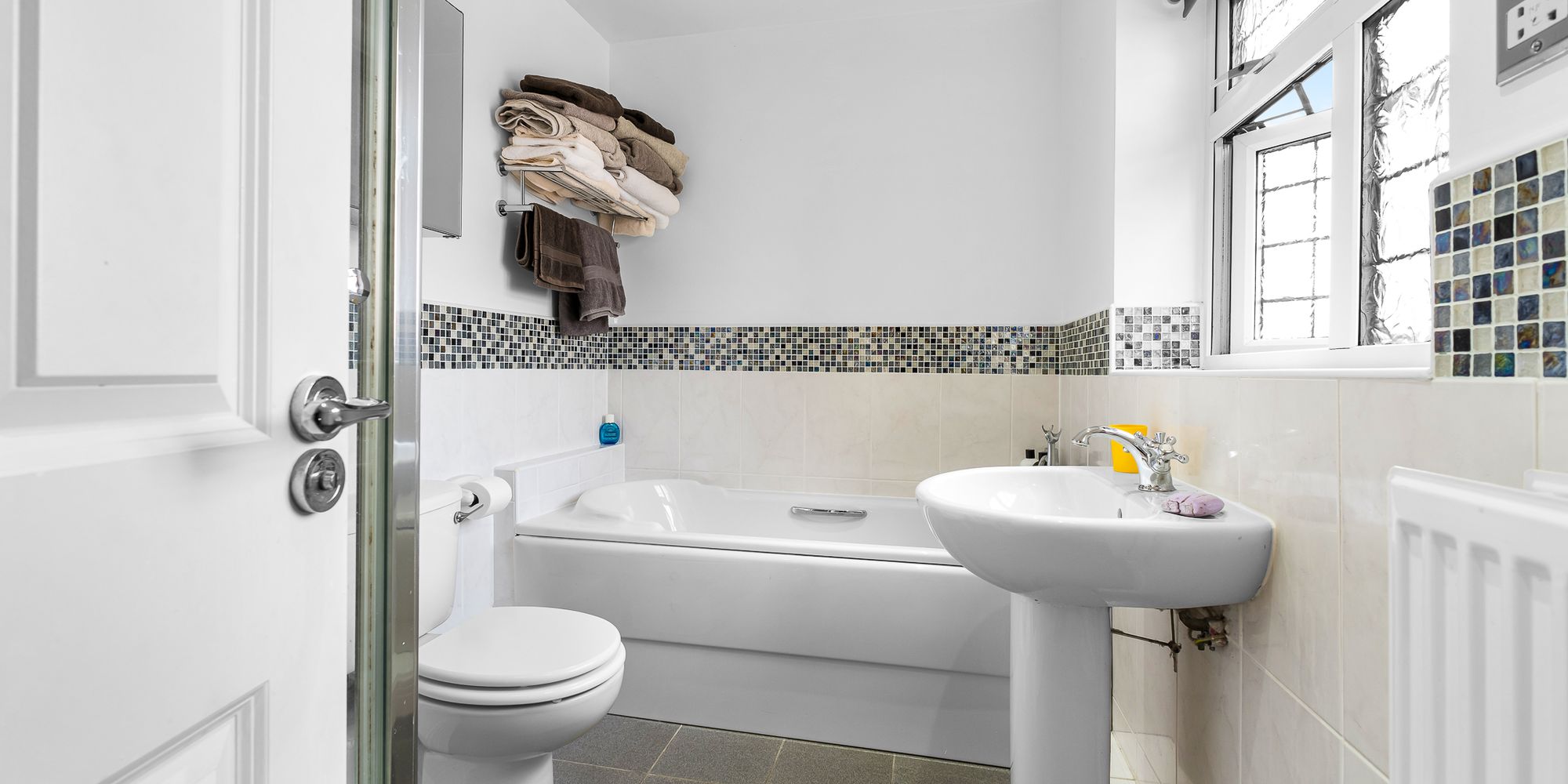 FAMILY BATHROOM Dimensions: 8' 5" x 7' 5" (2.57m x 2.28m). White suite comprising low level wc, wash hand basin, panelled bath with shower mixer tap. Part tiled walls. Tiled flooring. Electric shaver point. Extractor fan. Recessed spotlights. Obscured glass window to rear. Radiator.