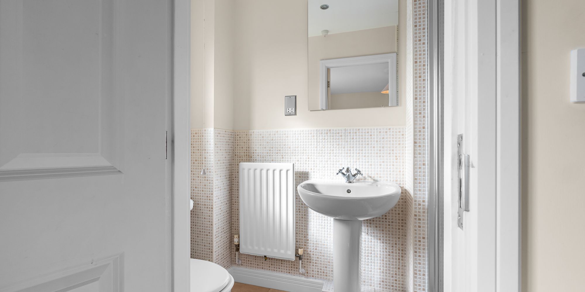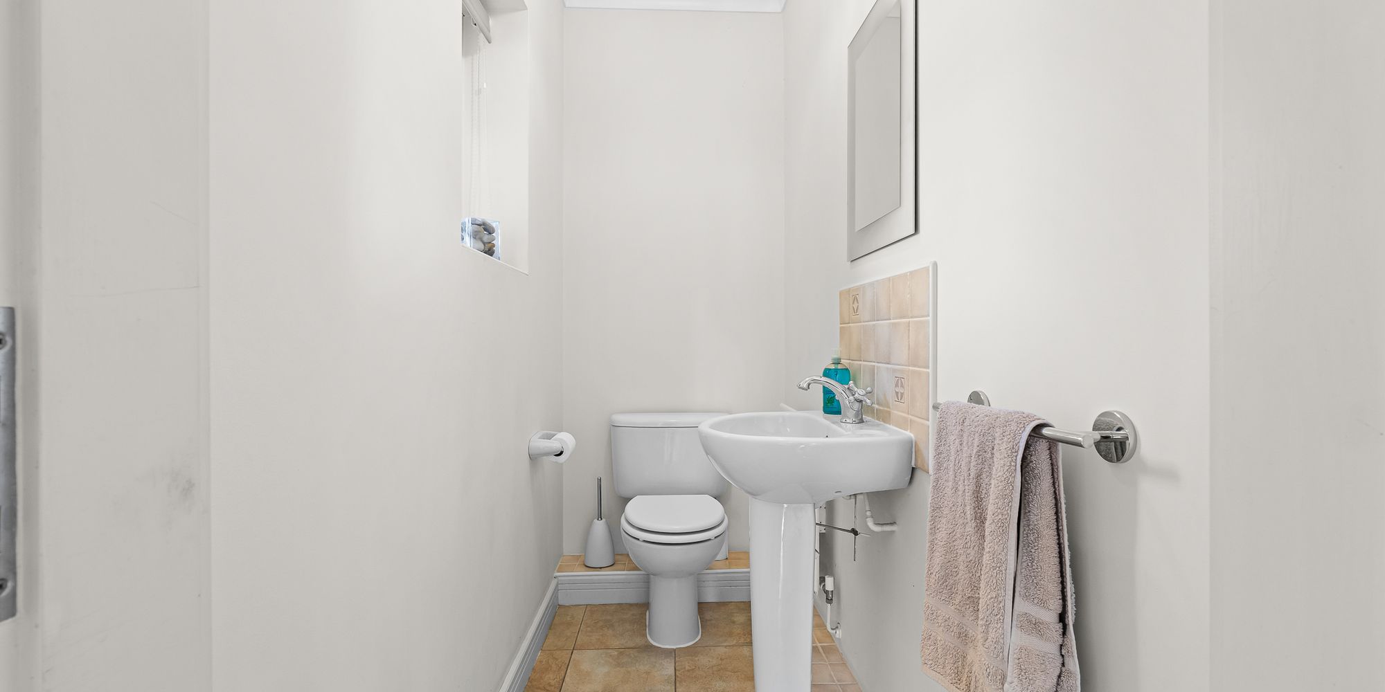 CLOAKROOM Comprising low level wc and wash hand basin. Tiled splash back. Tiled flooring. Obscured glass window to side. Radiator.