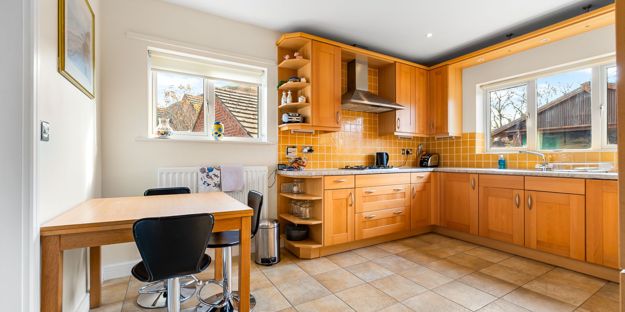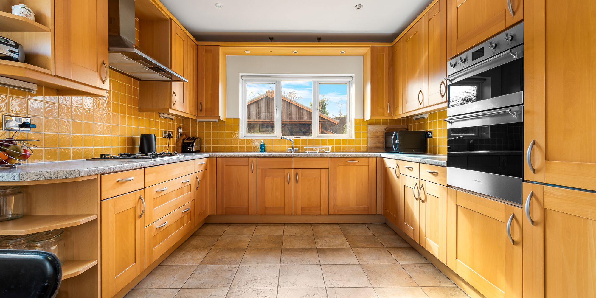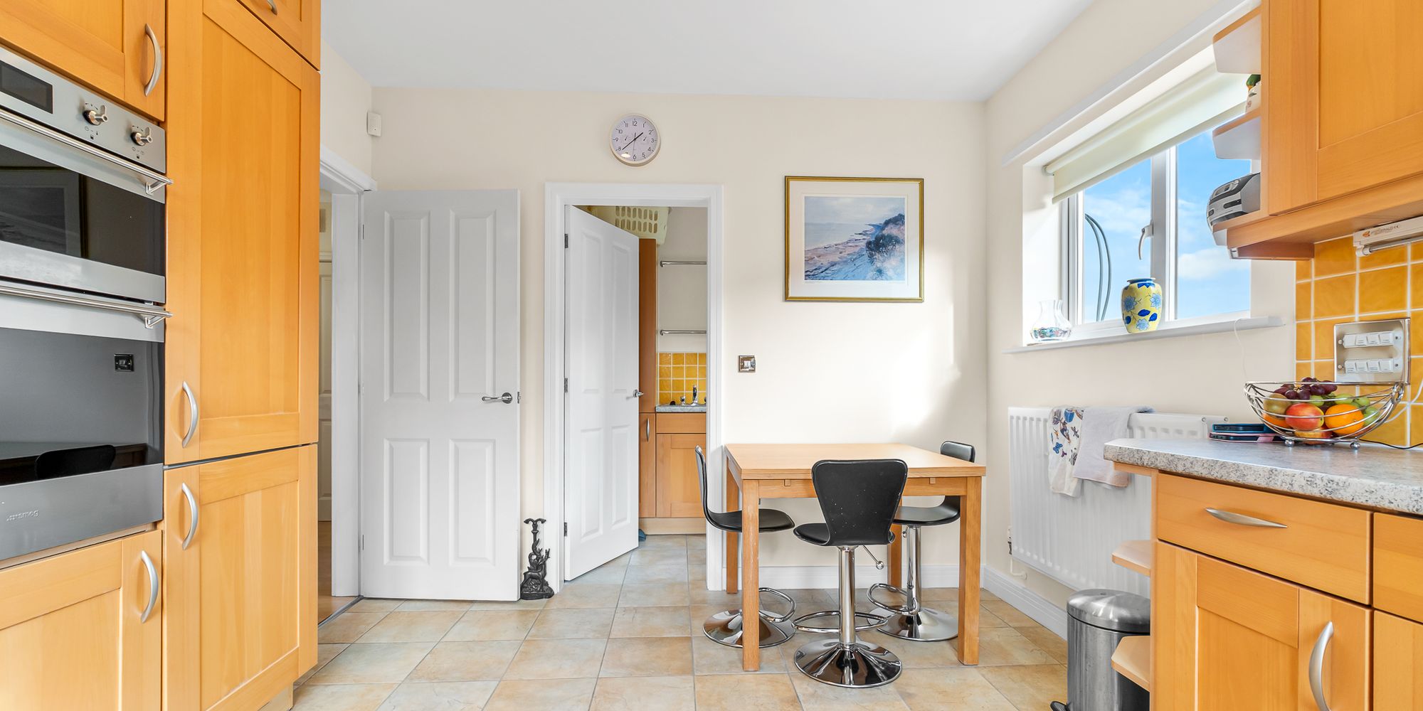 KITCHEN AND BREAKFAST ROOM Dimensions: 13' 10" x 10' 10" (4.22m x 3.32m). Well appointed along three sides in 'Alno' solid wood fronts beneath laminate worktop surfaces. Inset 1.5 bowl stainless steel sink with side drainer. Inset four ring gas hob with cooker hood above. Integrated 'Smeg' oven. Integrated dishwasher. Integrated fridge freezer. Matching range of eye level wall cupboards. Windows to rear and side. Tiled splashback. Tiled flooring. Ample space for family breakfast table. Radiator. Door to utility room.