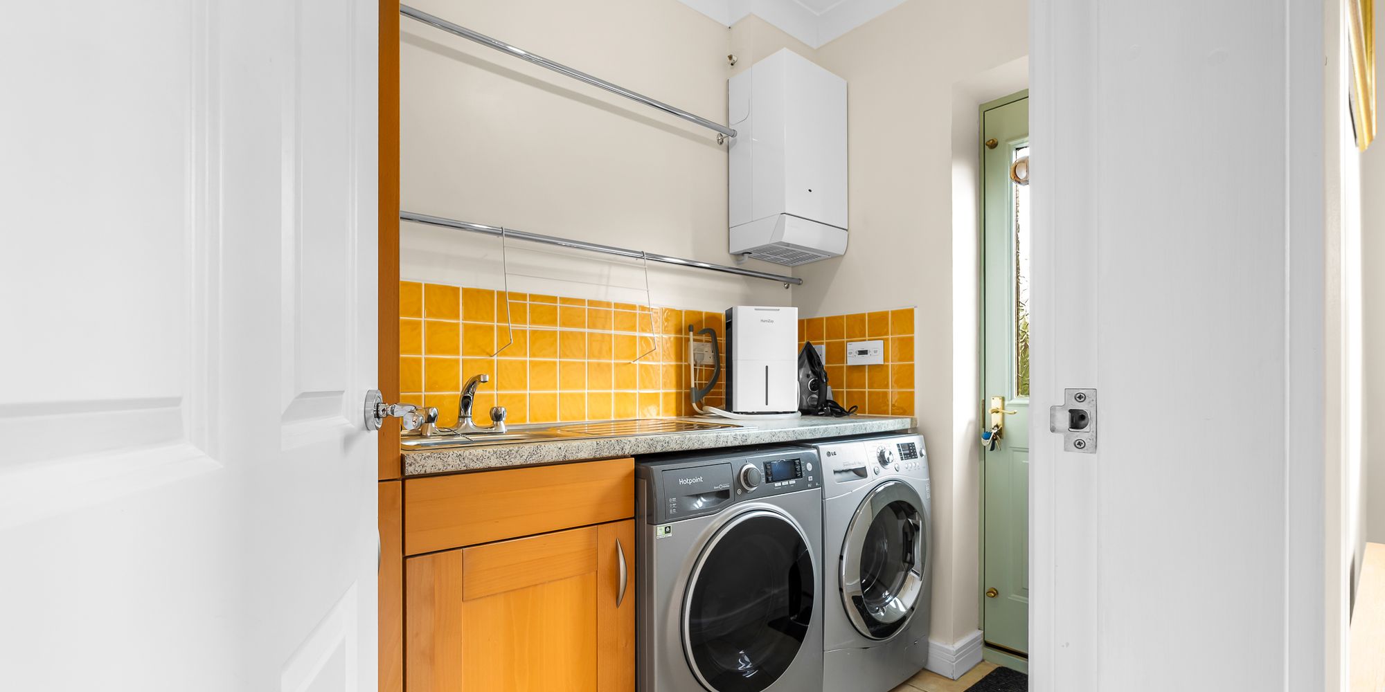 UTILITY ROOM Dimensions: 7' 6" x 5' 0" (2.29m x 1.53m). With units and worktop to one side. Inset stainless steel sink with side drainer. Tiled splash back. Plumbing for washing machine. Space for tumble dryer. Wall mounted 'Ideal Classic' gas central heating boiler. Door to side. Tiled flooring. Radiator.