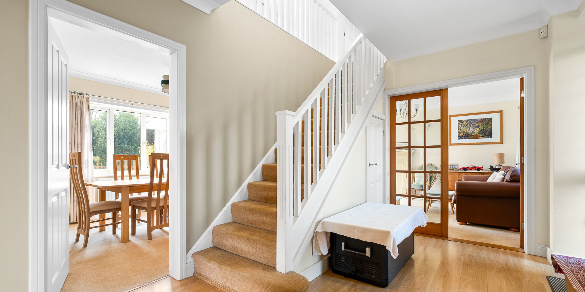 ENTRANCE HALLWAY Dimensions: 14' 11" x 9' 3" (4.55m x 2.84m). Approached via a woodgrain effect uPVC paneled entrance door with double glazed windows to upper part leading to the spacious entrance hallway. Staircase to first floor with under stairs storage cupboard. Laminate flooring. Radiator. Additional storage cupboard.