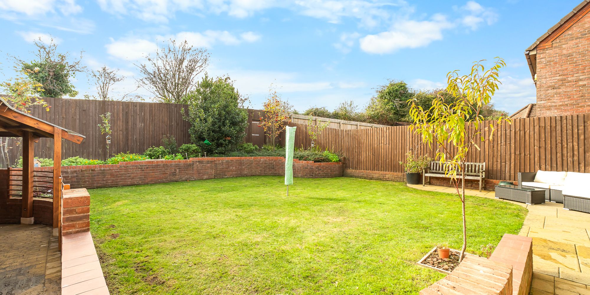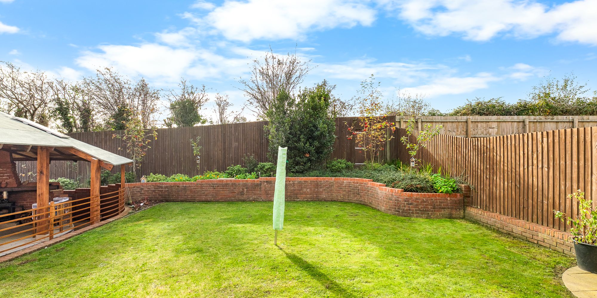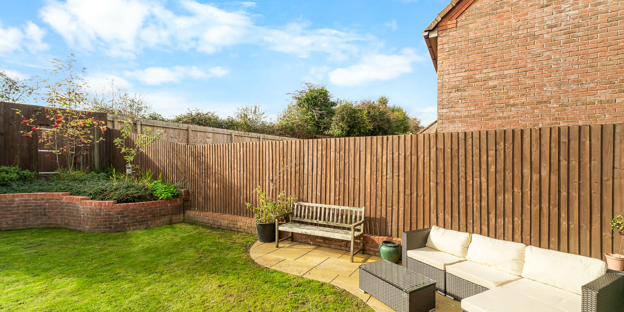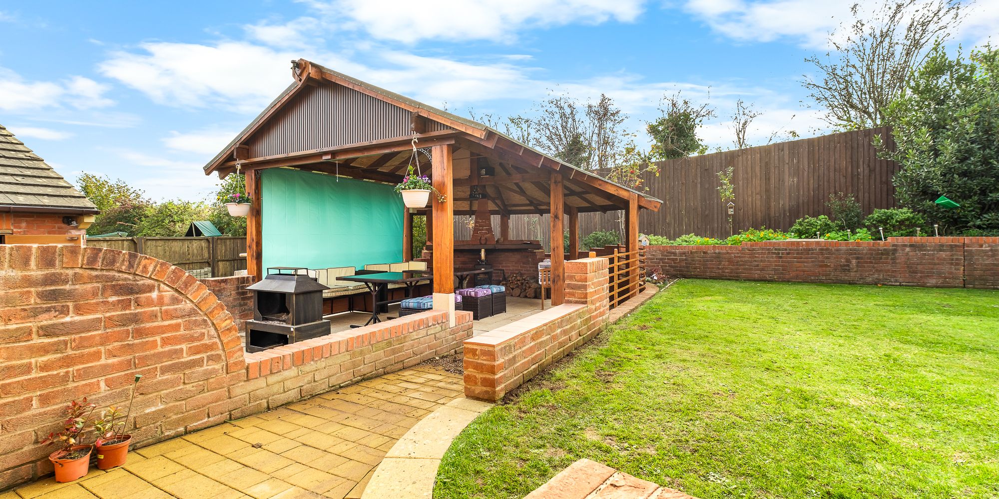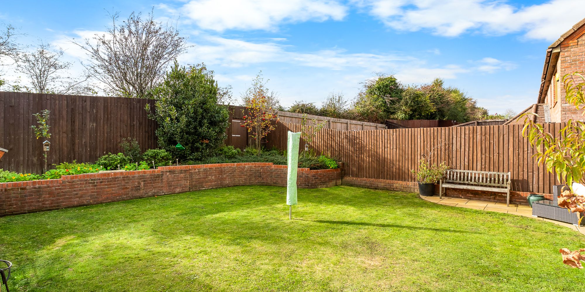 Flat area behind garage ready to build garden room, or left as lawn for a children’s play area. In addition, there are walled flower beds or veg beds and an area for compost bins and a garden shed at a later date.