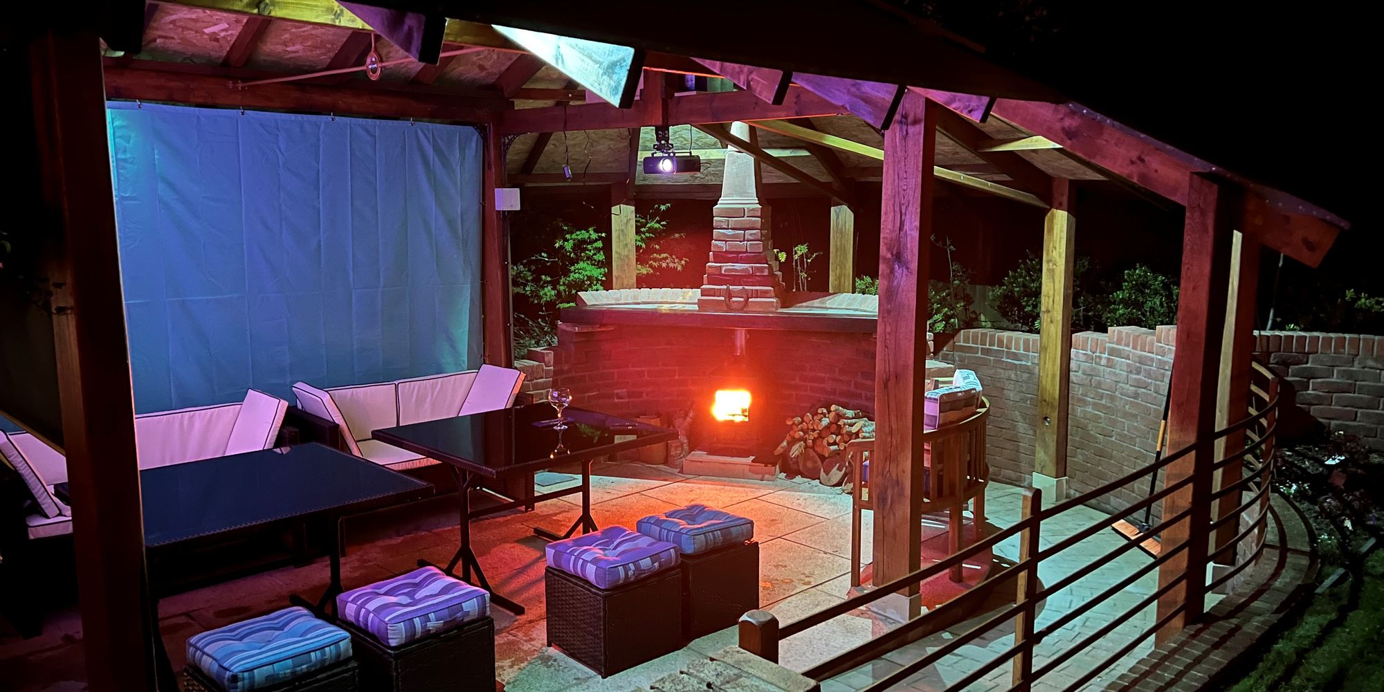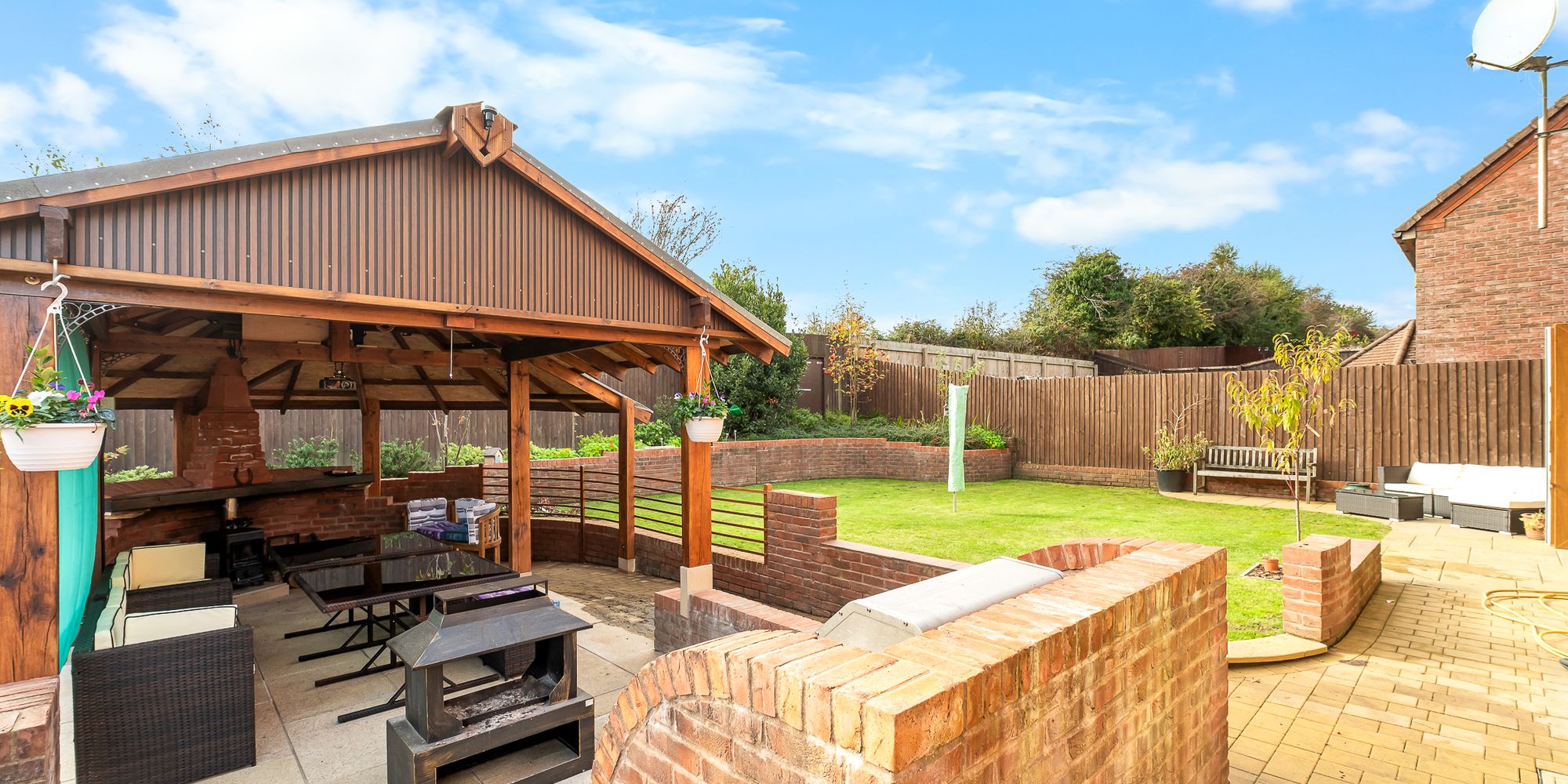 Large Granite Paved patio area behind kitchen with a roofed Pergola that has a fire place with a Morso Squirrell Log Burner and also a small stand-alone Solar Power System powering a 2000 watt Inverter to 240v power sockets used to run an overhead projector and the BBQ Rotisserie.