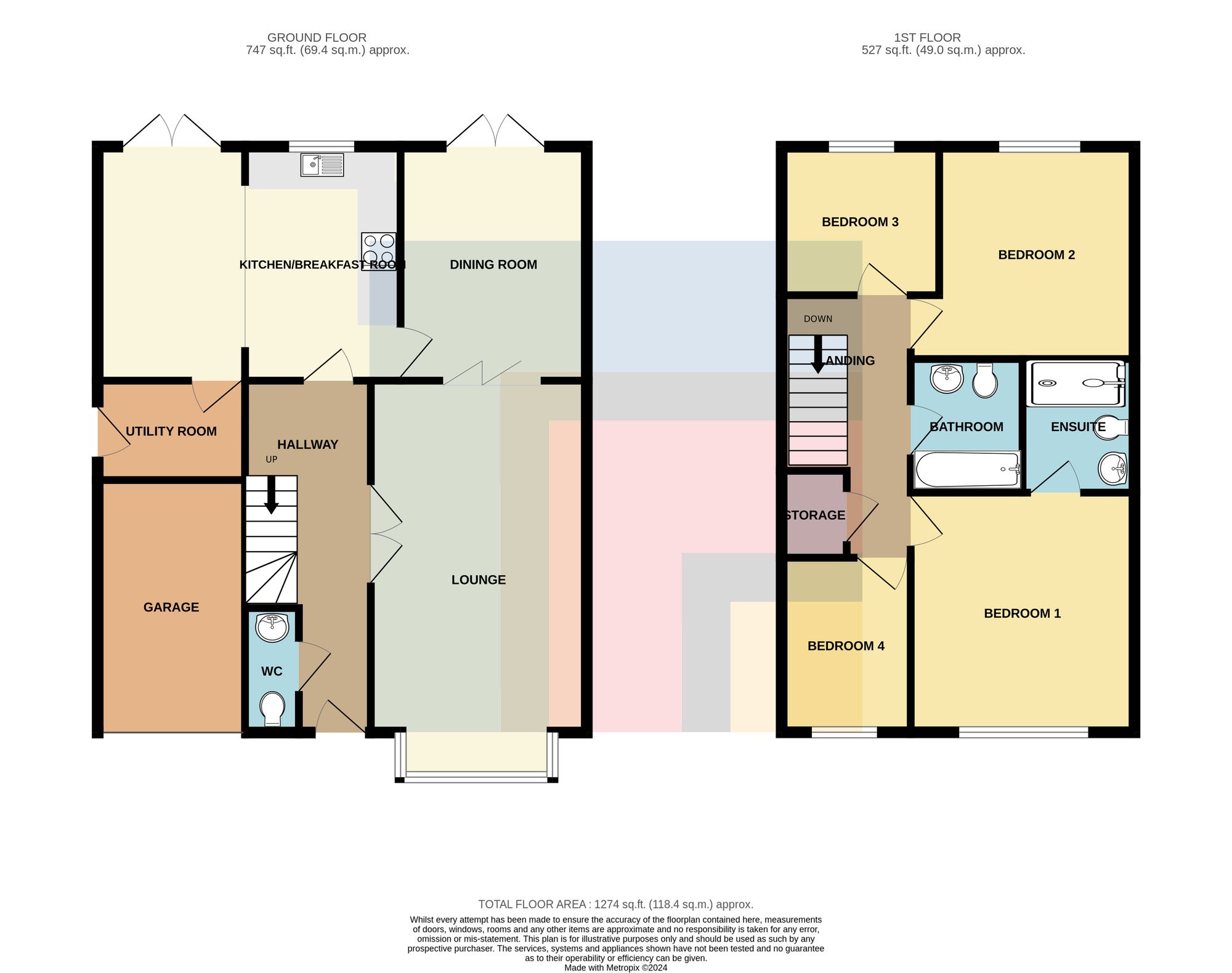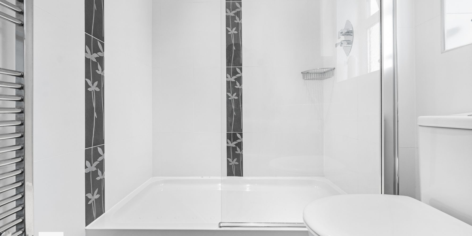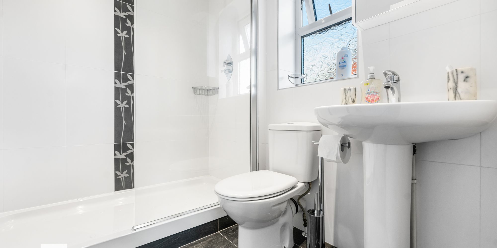 ENSUITE Dimensions: 6' 7" x 5' 4" (2.03m x 1.65m). Modern white suite; low level WC, pedestal wash hand basin, double step in shower with chrome shower and glass screen. Extractor fan. Shaving point. Mirrored wall cabinet. Chrome heated towel rail. Tiled walls and tiled floor. Spotlights. Obscured glass window to side.