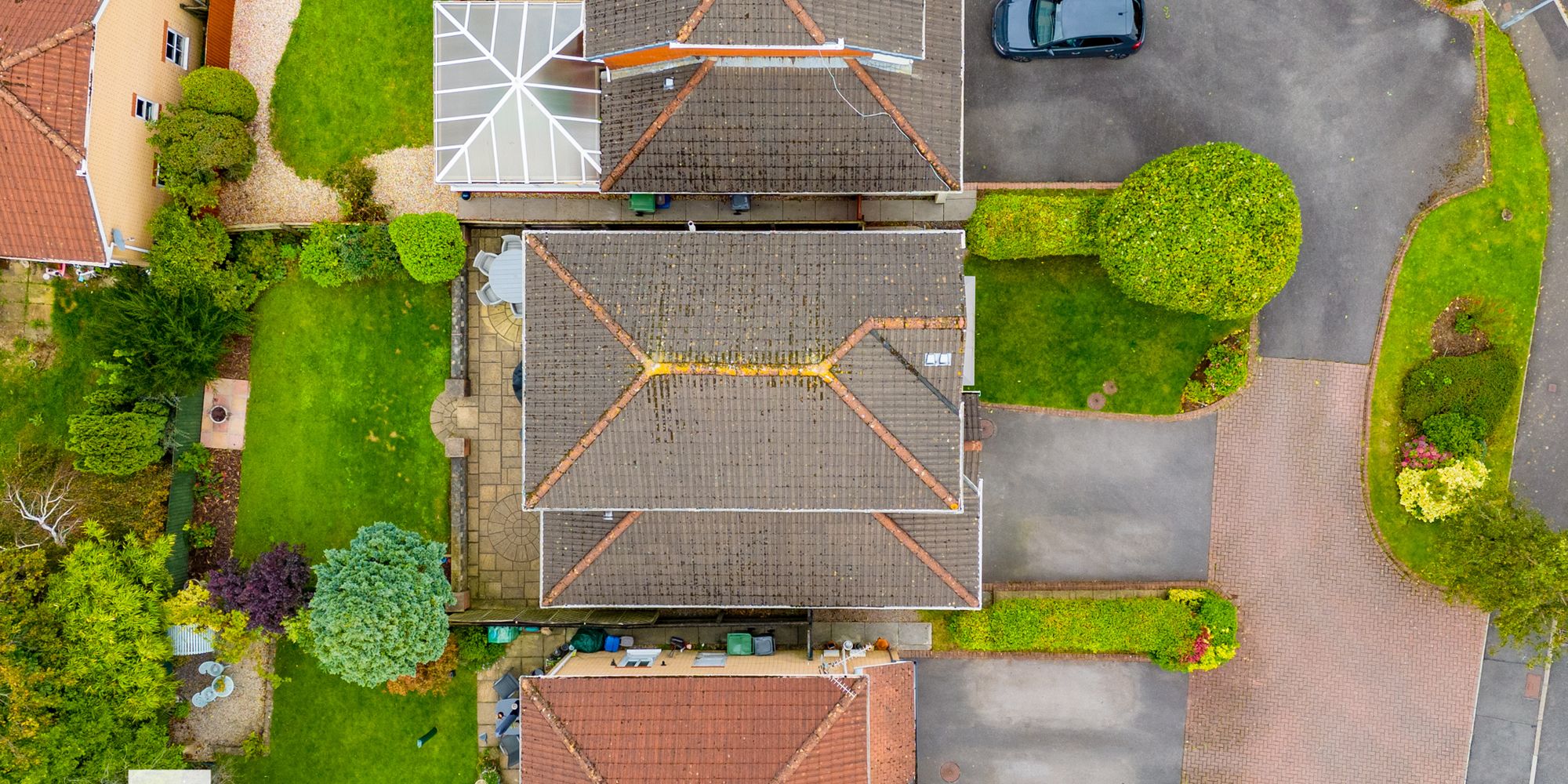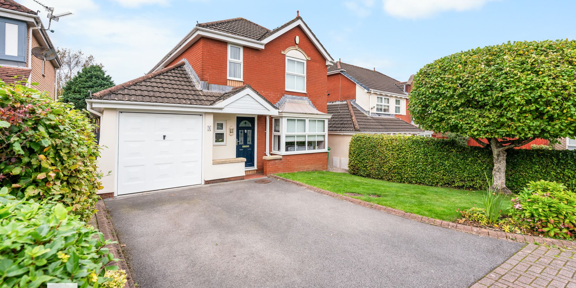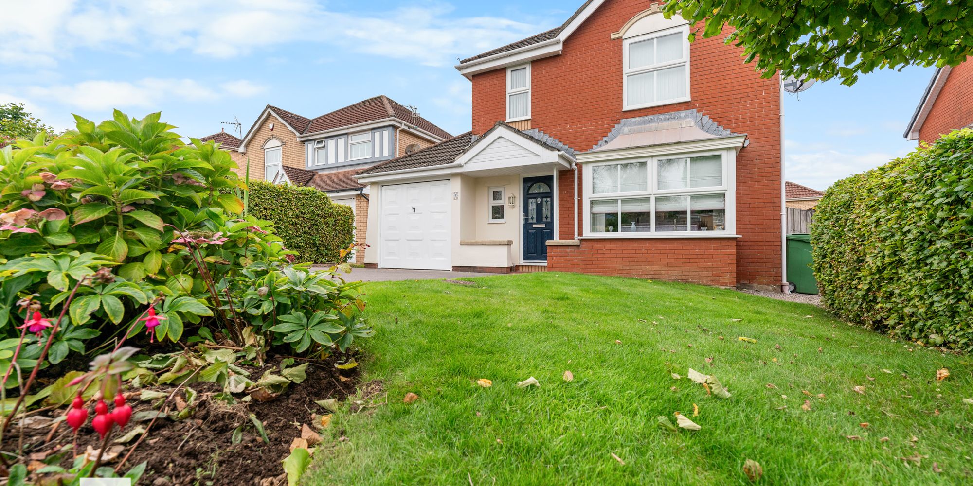 FRONT GARDEN Laid to lawn bordered by hedges. Open porch. Driveway with parking for two vehicles.