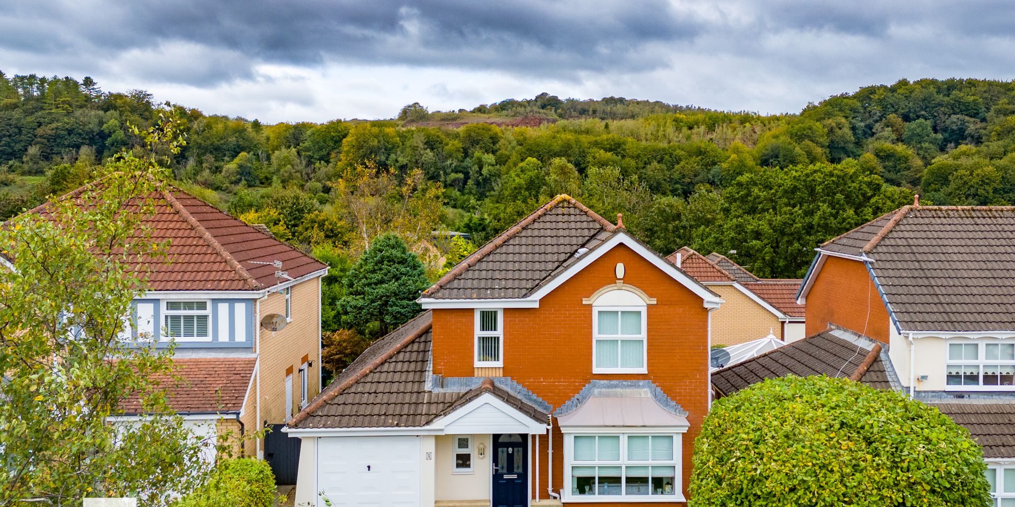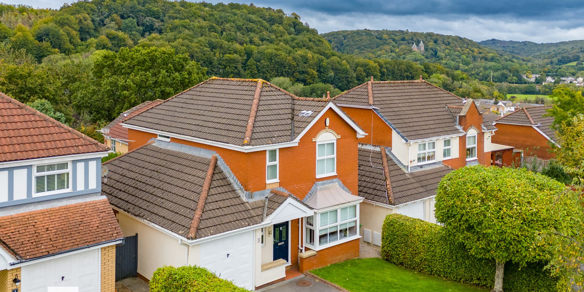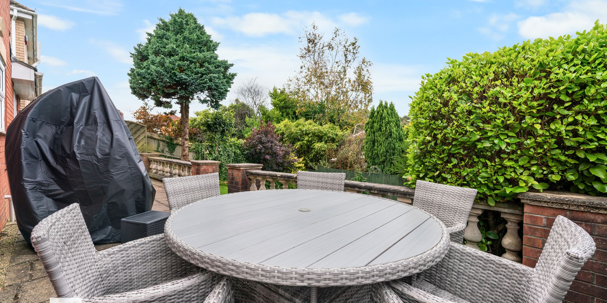 FRONT GARDEN Laid to lawn bordered by hedges. Open porch. Driveway with parking for two vehicles.