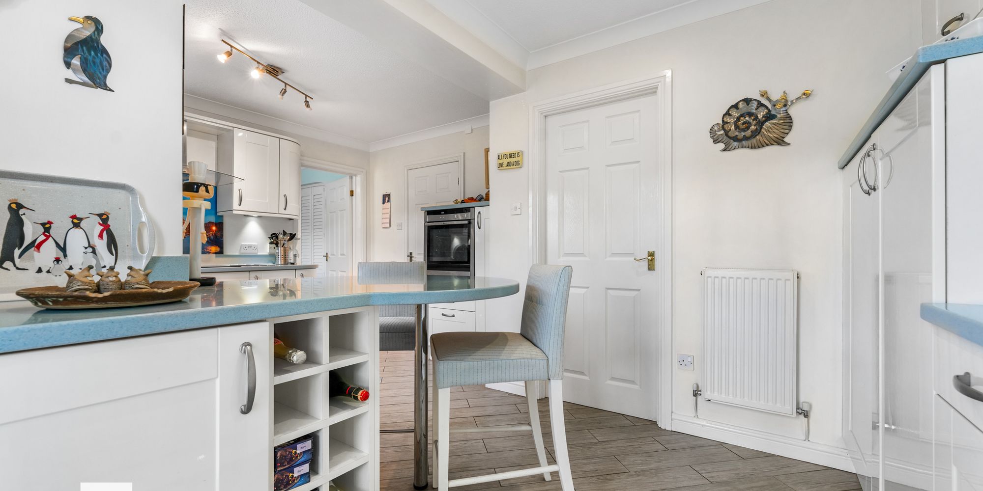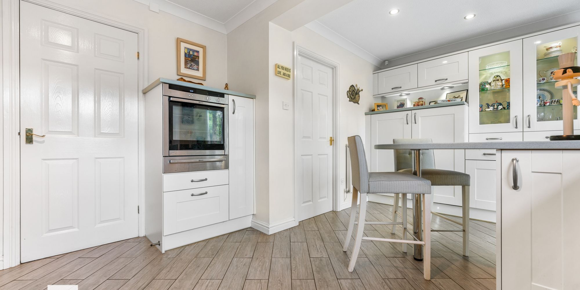 KITCHEN Dimensions: 16' 3" x 11' 6" (4.97m x 3.52m). Appointed along four walls, eye and low level cupboards beneath corian worktops. Inset single bowl ceramic/stainless steels sink, chrome mixer tap, 'Quooker' hot water tap, 'Neff' induction hob with hood, integrated 'NEFF' slide and hide single oven with heat drawer, integrated dishwasher, and integrated fridge and freezer. Radiator. uPVC French doors opening into patio area. uPVC window to rear. Door to utility room.