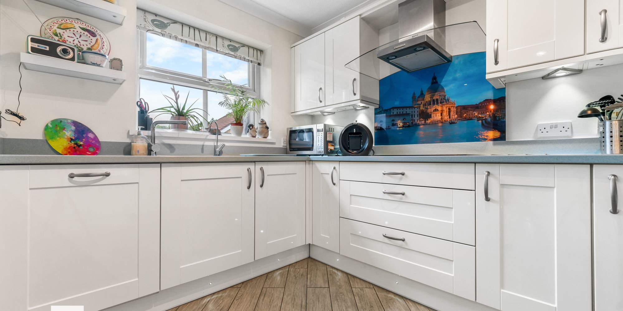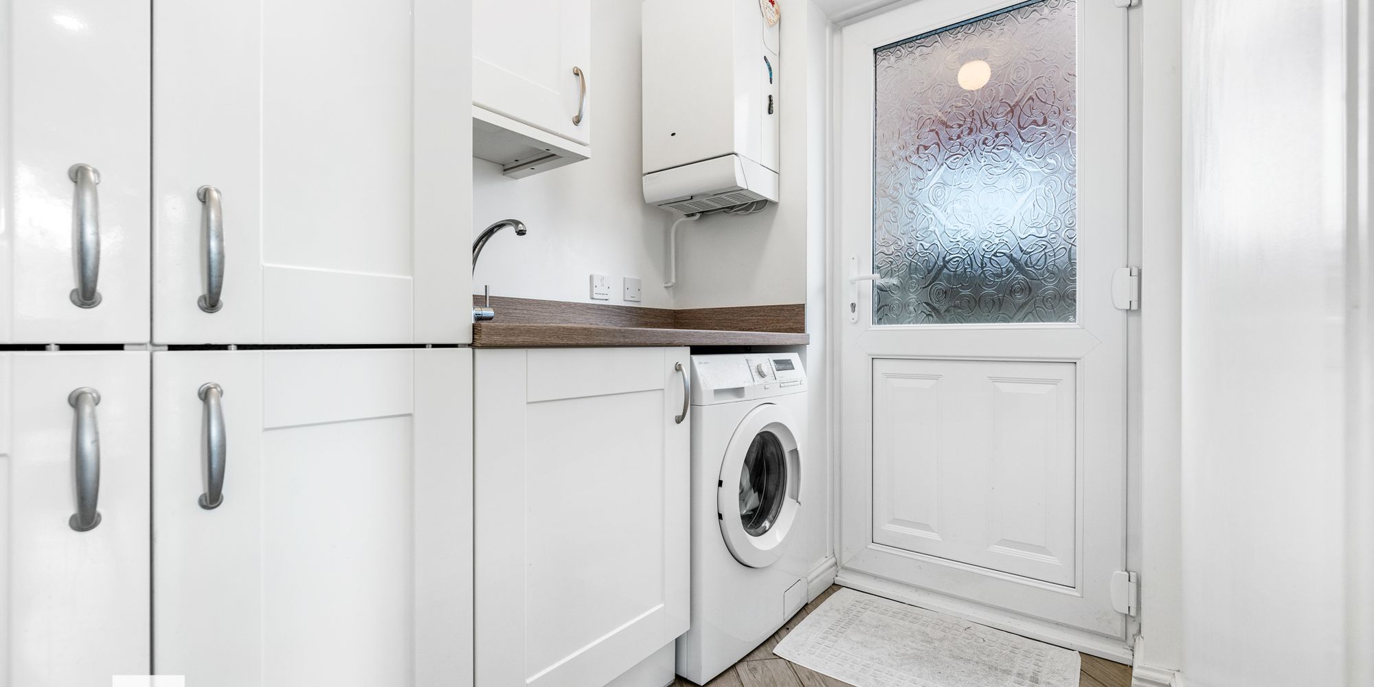 UTILITY ROOM Dimensions: 7' 4" x 5' 0" (2.25m x 1.53m). Matching eye and low level cupboards beneath good quality laminate countertop and splashback, round, stainless steel sink with chrome mixer tap. Plumbing for washing machine. Wall mounted gas central heating boiler. Radiator. Tiled flooring. uPVC obscured glass door to side. Loft hatch.