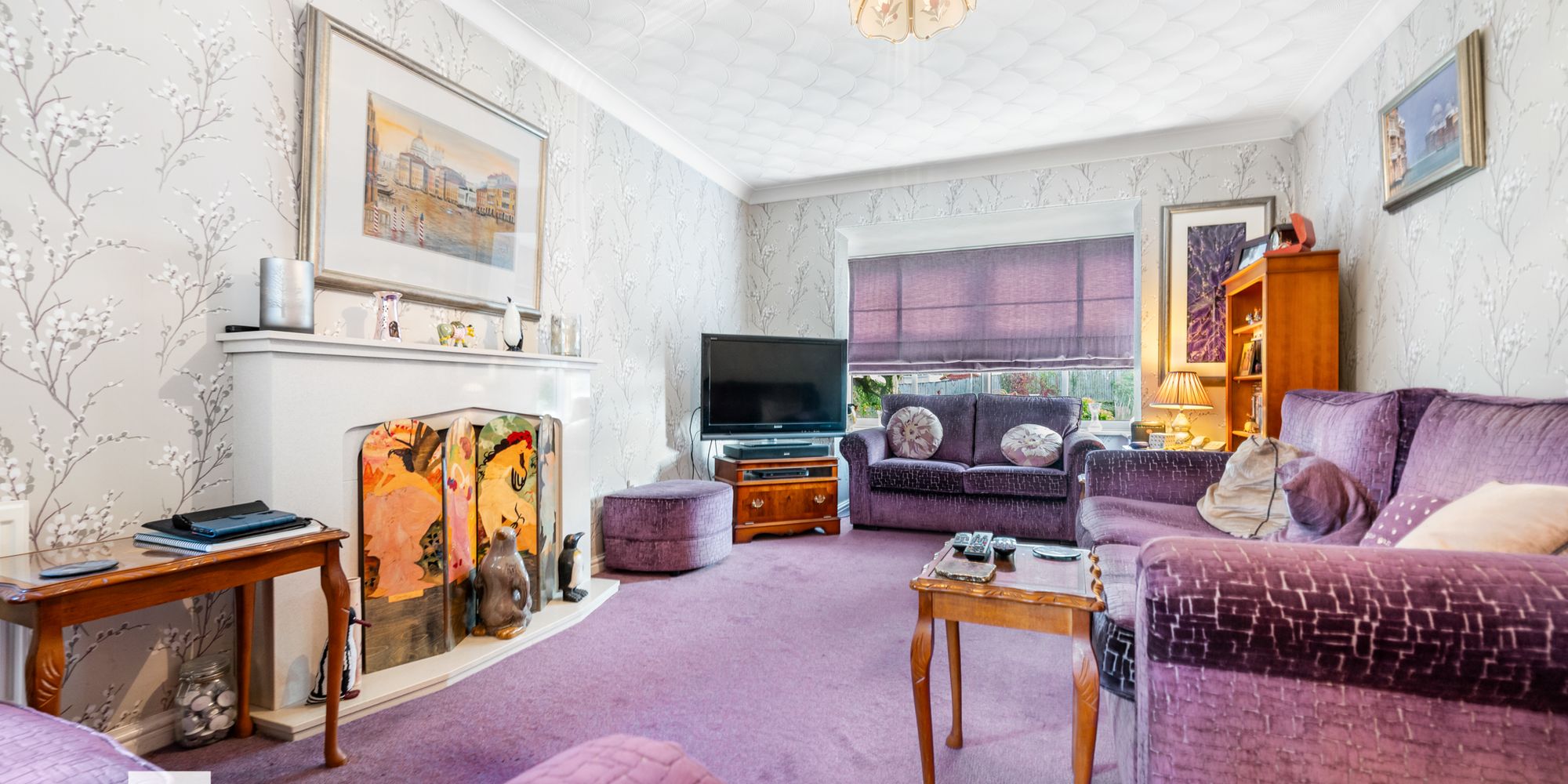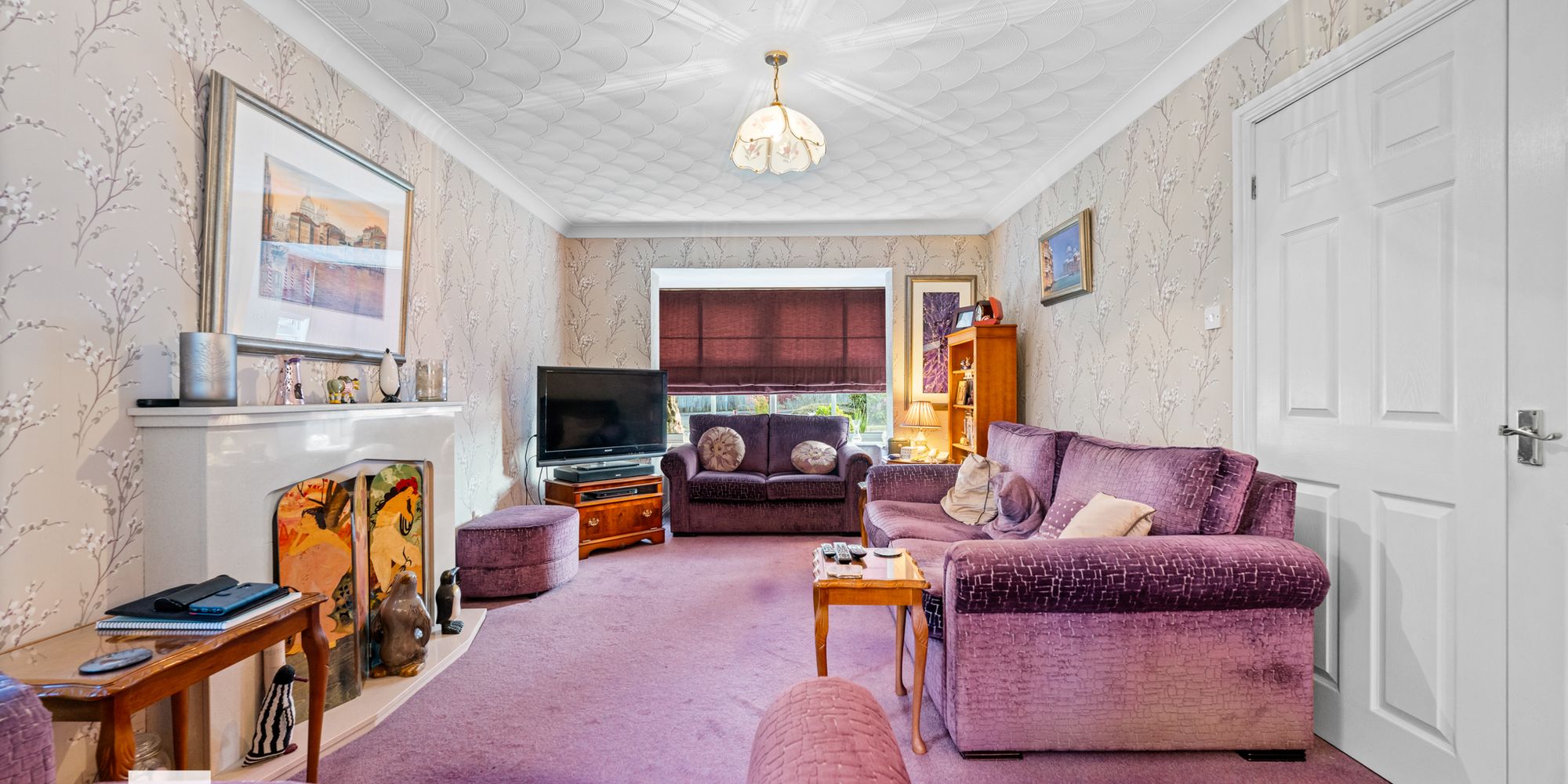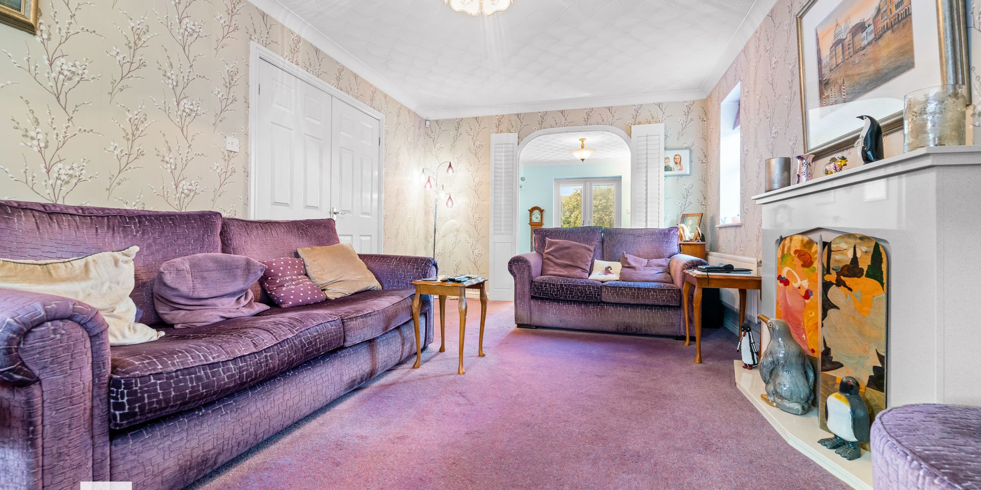 LOUNGE Dimensions: 17' 11" x 10' 10" (into bay)(5.48m x 3.32m). A spacious family lounge with gas fire, marble mantelpiece and hearth. Two radiators. Bay window to front. Shuttered doors leading through to the dining room.