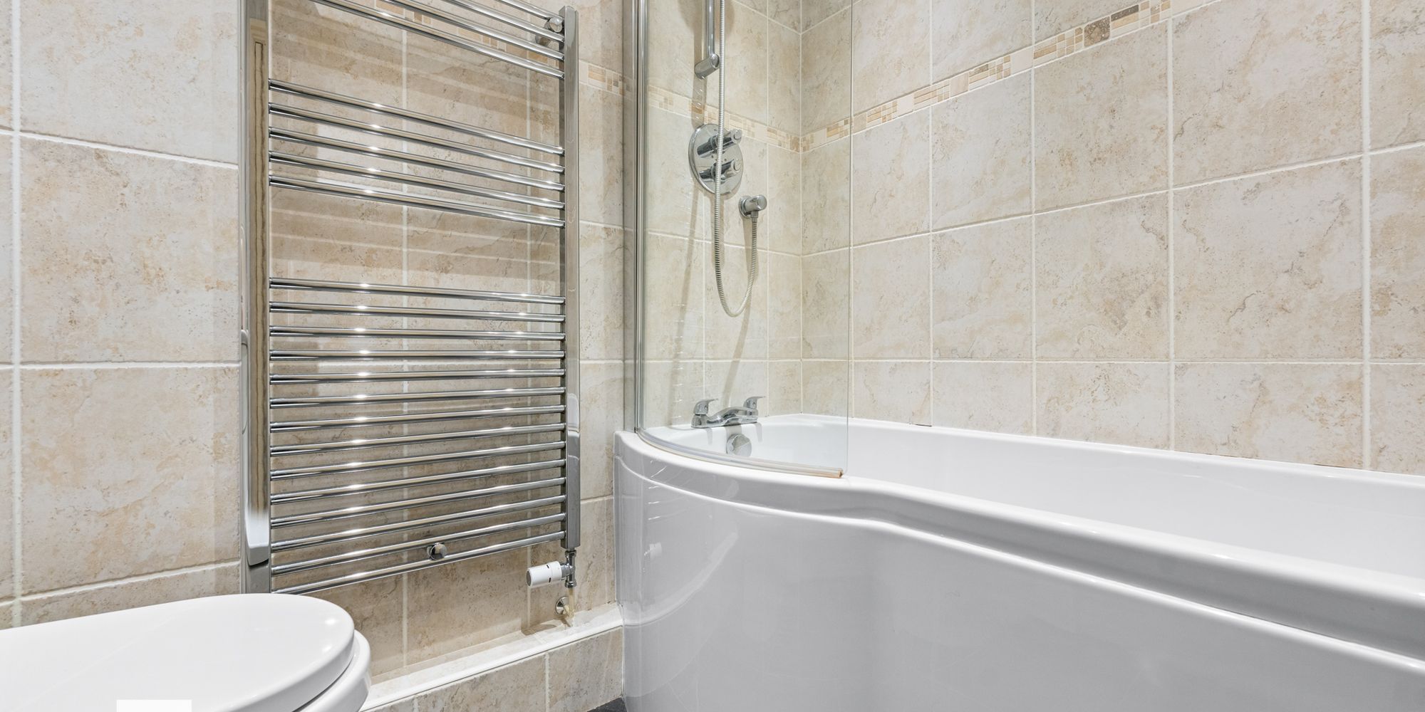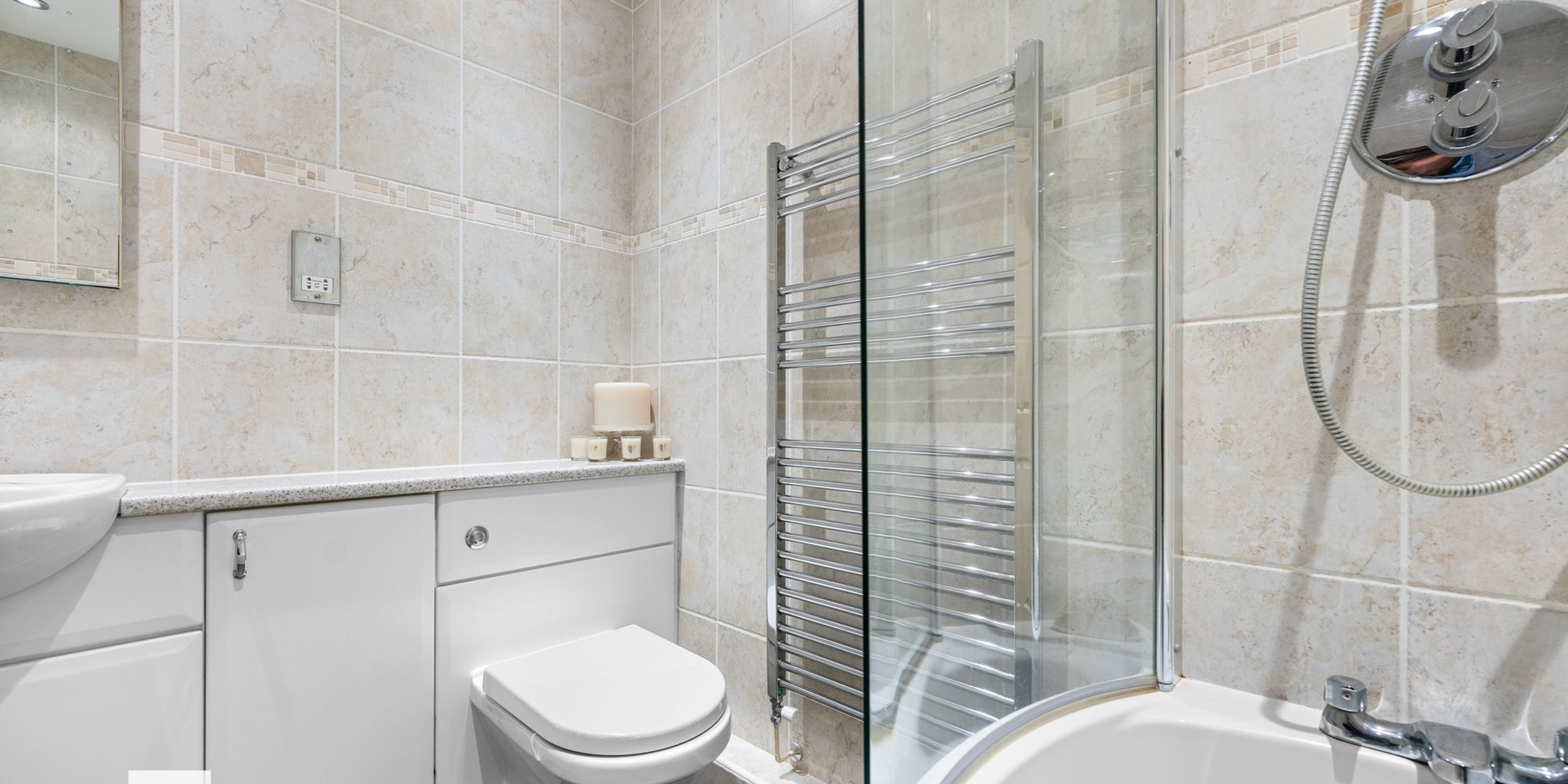 BATHROOM Dimensions: 6' 7" x 5' 5" (2.03m x 1.66m). White suite; combined low level WC with vanity and wash hand basin with chrome mixer tap. Curved bath with chrome mixer tap, chrome shower, shaving point, extractor fan. Tiled walls and tiled floor. Chrome heated towel rail. Spotlights.