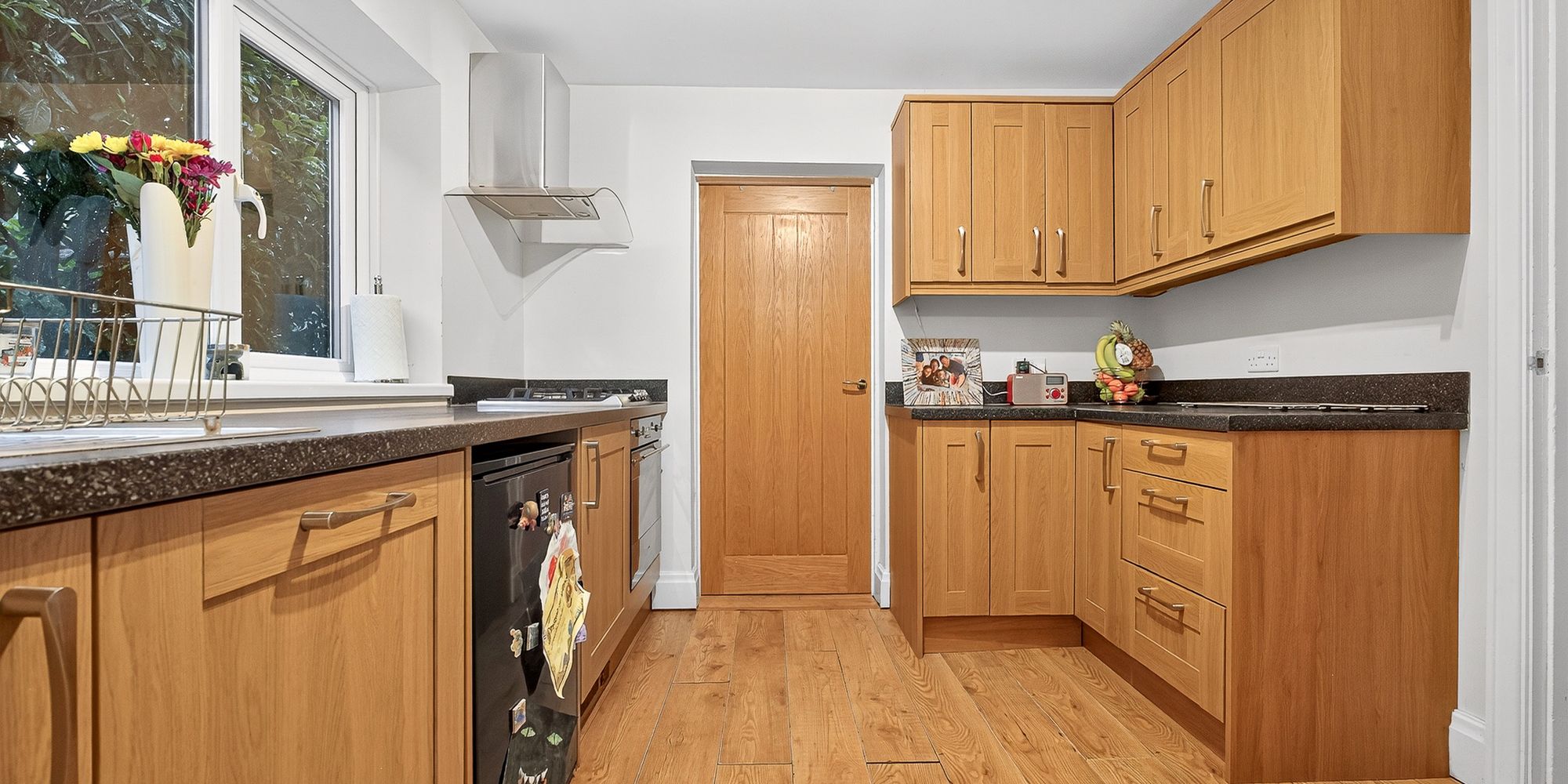 KITCHEN Dimensions: 10' 2" x 9' 2" (3.10m x 2.80m). A modern kitchen replaced in 2015. Double glazed uPVC window to side. Modern fitted kitchen with work surfaces incorporating stainless steel sink unit with mixer tap. Smeg oven and gas hob with extractor hood over. Integrated Smeg dishwasher. Space for fridge. Laminate flooring. Doors to the utility room / w.c and dining room.
