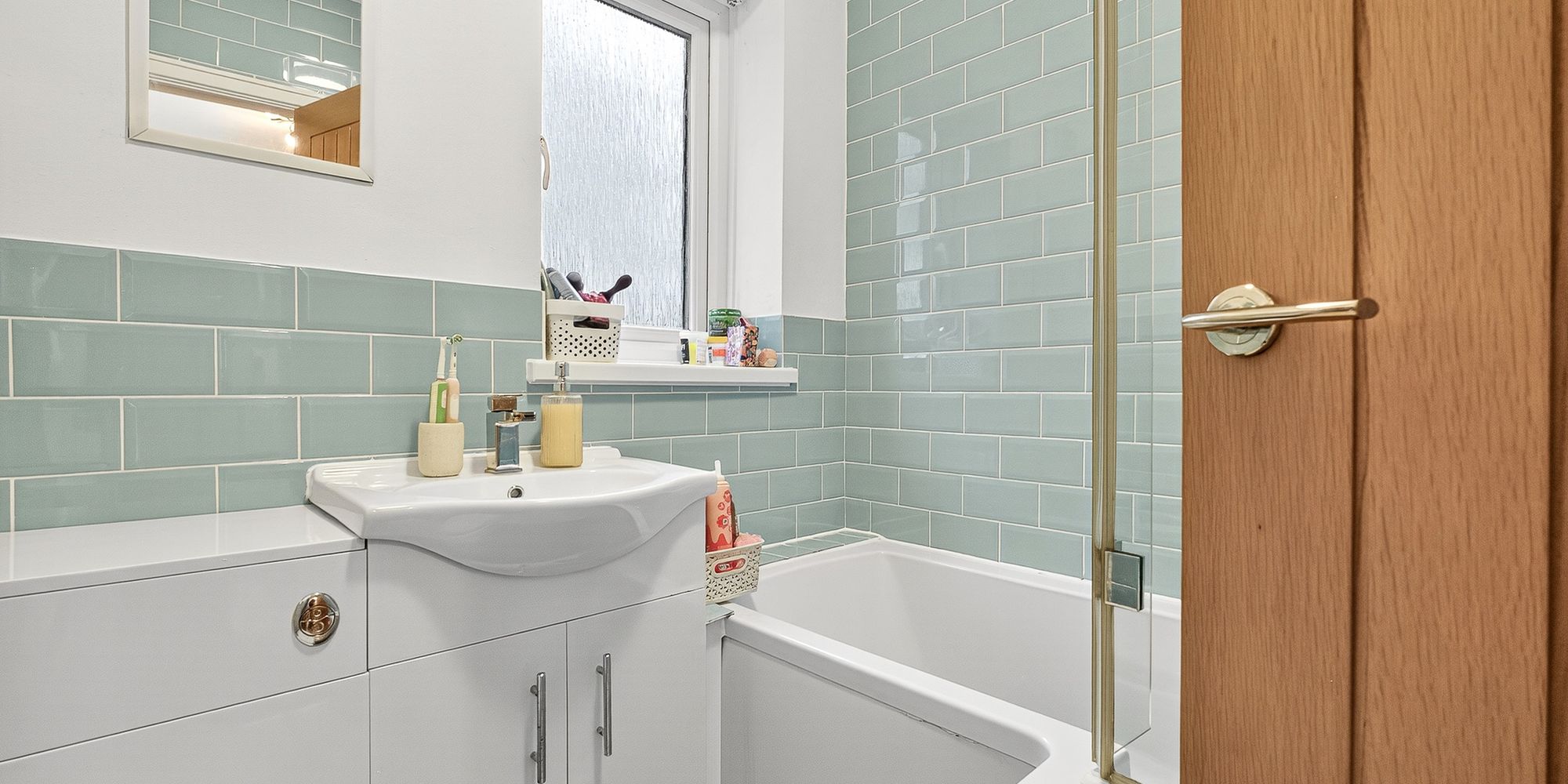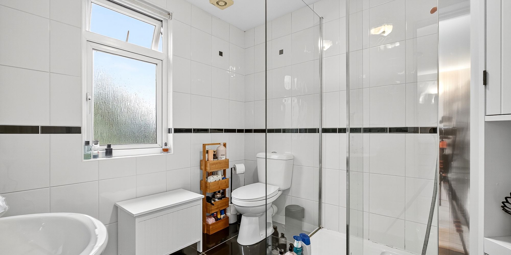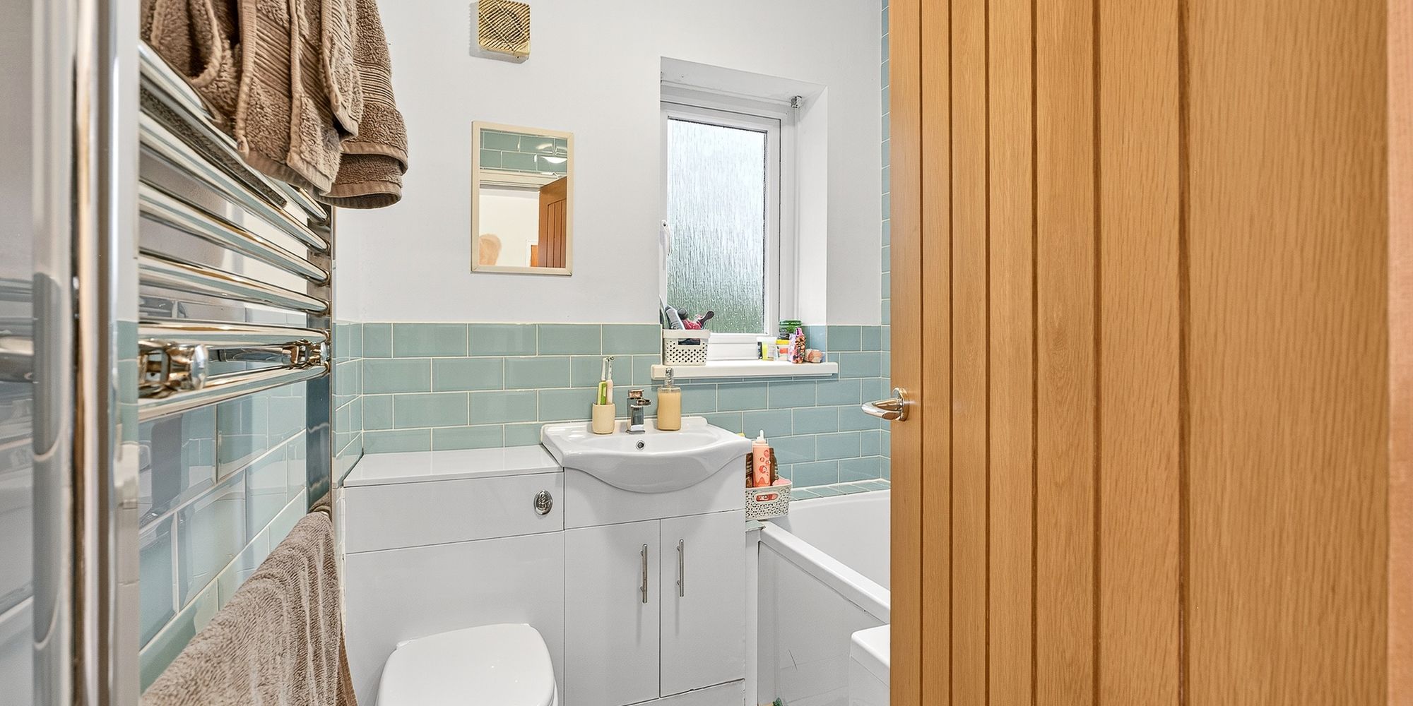 BATHROOM Modern bathroom, replaced in 2015. Obscured double glazed uPVC window to rear. P shaped bath with shower over and screen, vanity enclosed wash hand basin, w.c. Chrome heated towel rail. Part tiled walls.