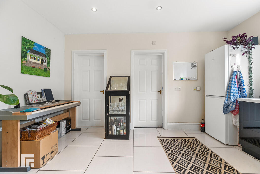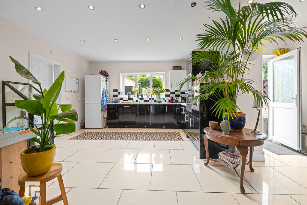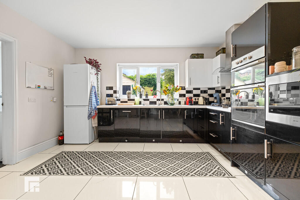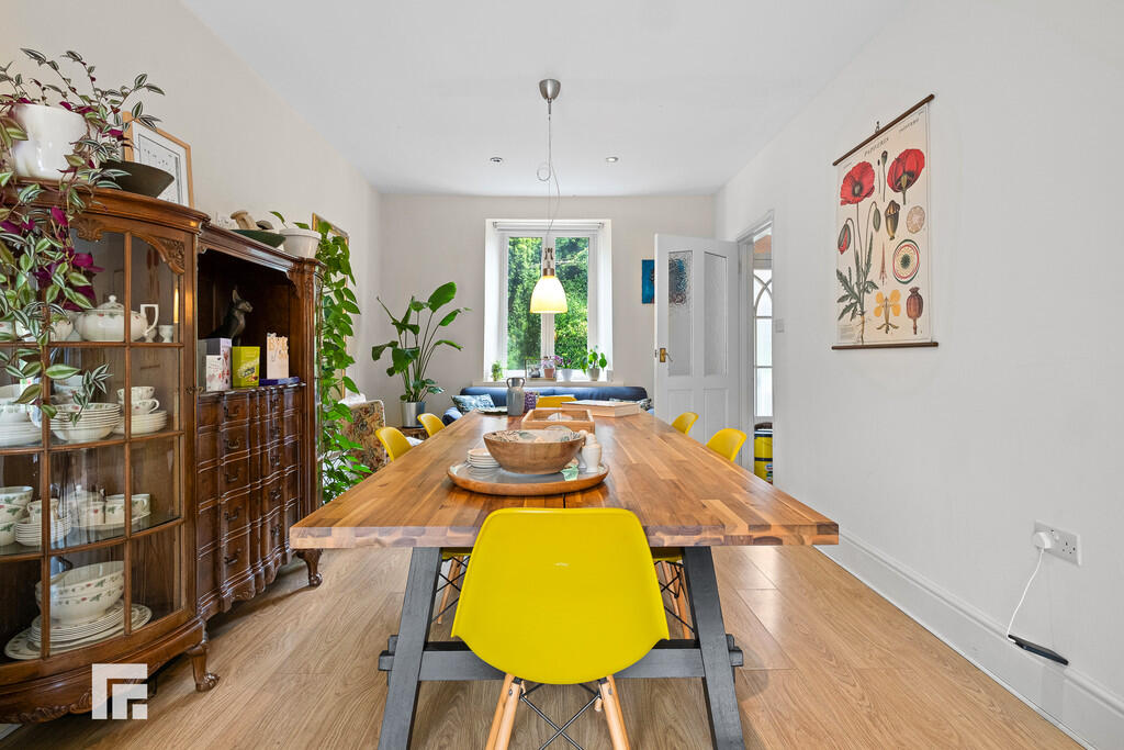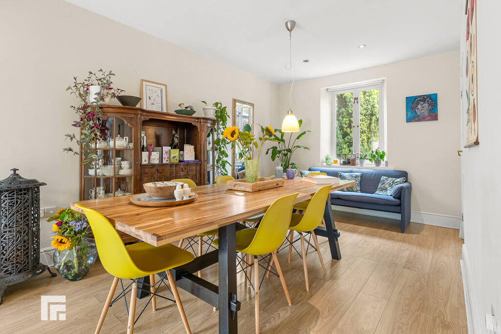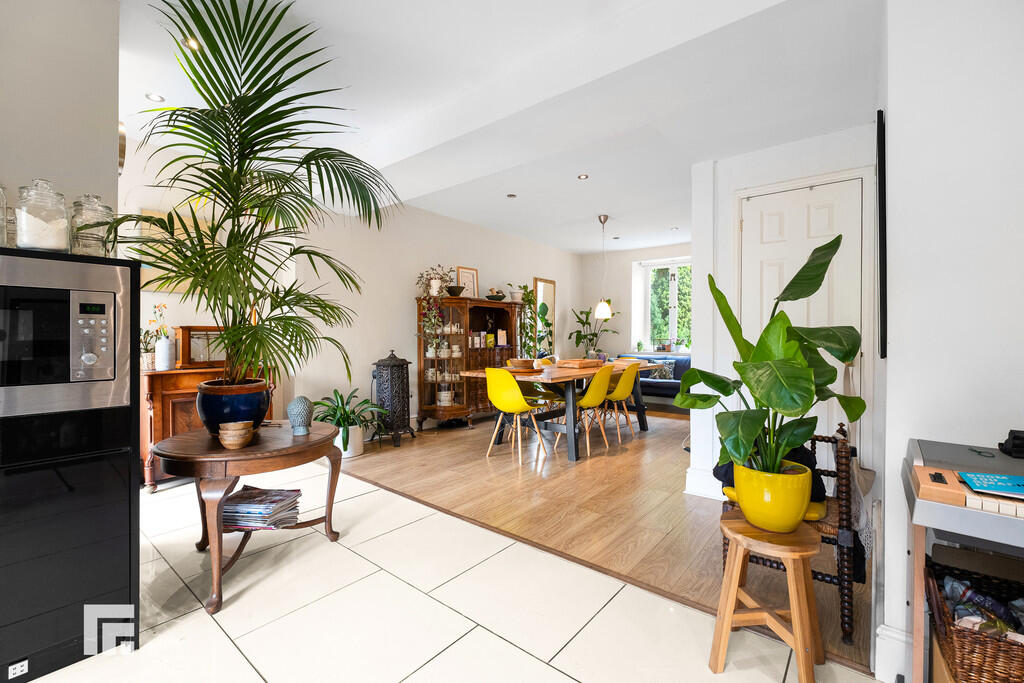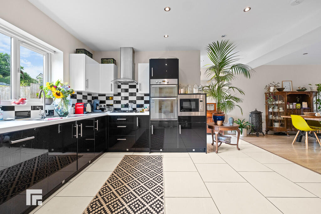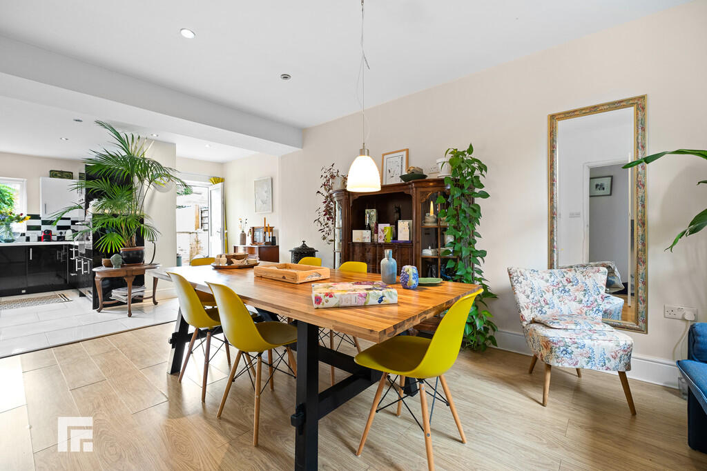 KITCHENANDDINER30' 6" x 18' 9"(max) (9.31m x 5.74m) An excellent sized open plan kitchen and diner with modern fitted kitchen along two sides. Inset 1.5 bowl stainless steel sink with side drainer. Inset four ring gas hob with curved glass cooker hood above. integrated oven. Integrated microwave. Space for fridge freezer. Matching range of eye level wall cupboards. Window overlooking the rear garden. French doors with rear access. Tiled flooring to kitchen area. Doors to utility room and ground floor shower room. There is a large family dining area with window to front. Laminate flooring to dining area. Under stairs storage cupboard.