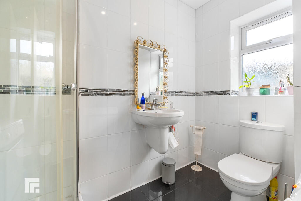 ENSUITESHOWERROOM6' 9" x 6' 0" (2.07m x 1.83m) Modern white suite comprising low level wc, wash hand basin, corner shower cubicle with 'Mira' shower above. Tiled flooring. Full wall tiling. Obscure glass window to front. Extractor fan. Heated towel rail.