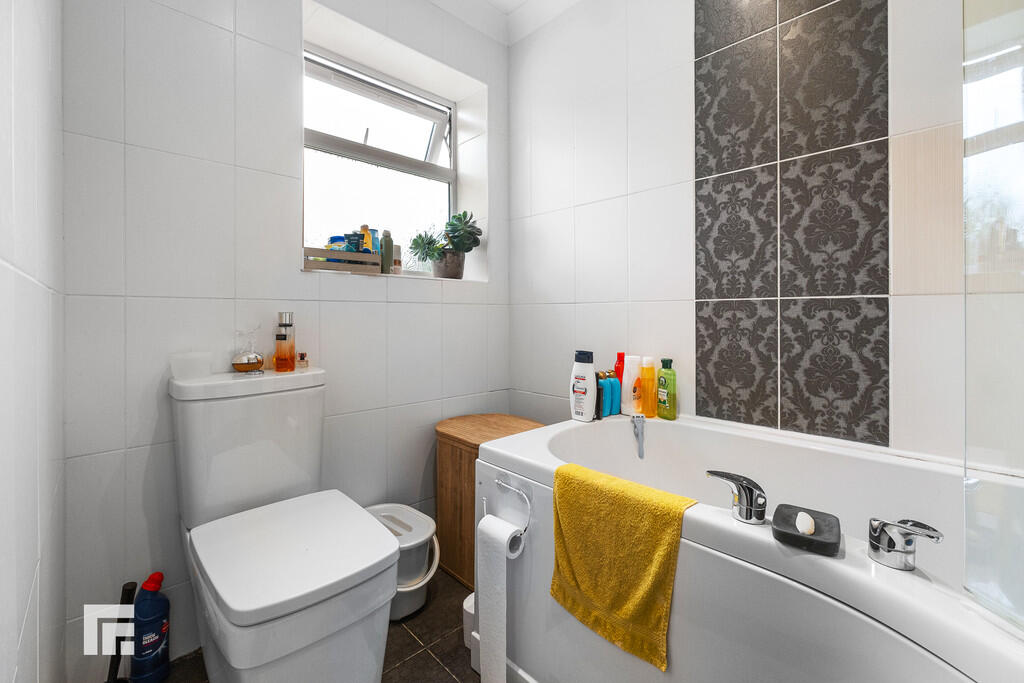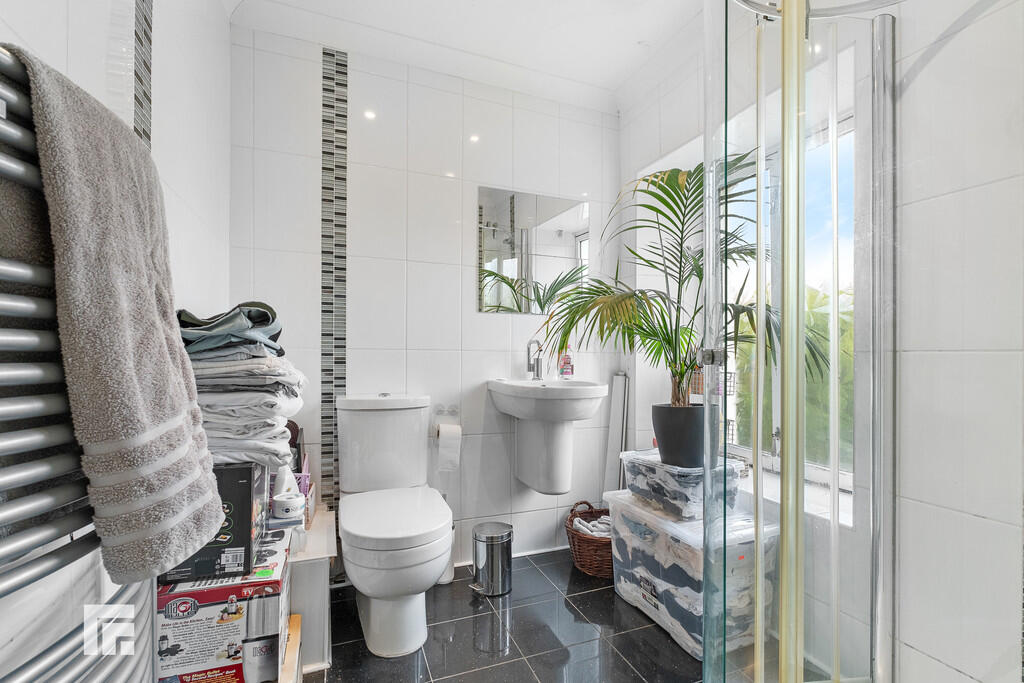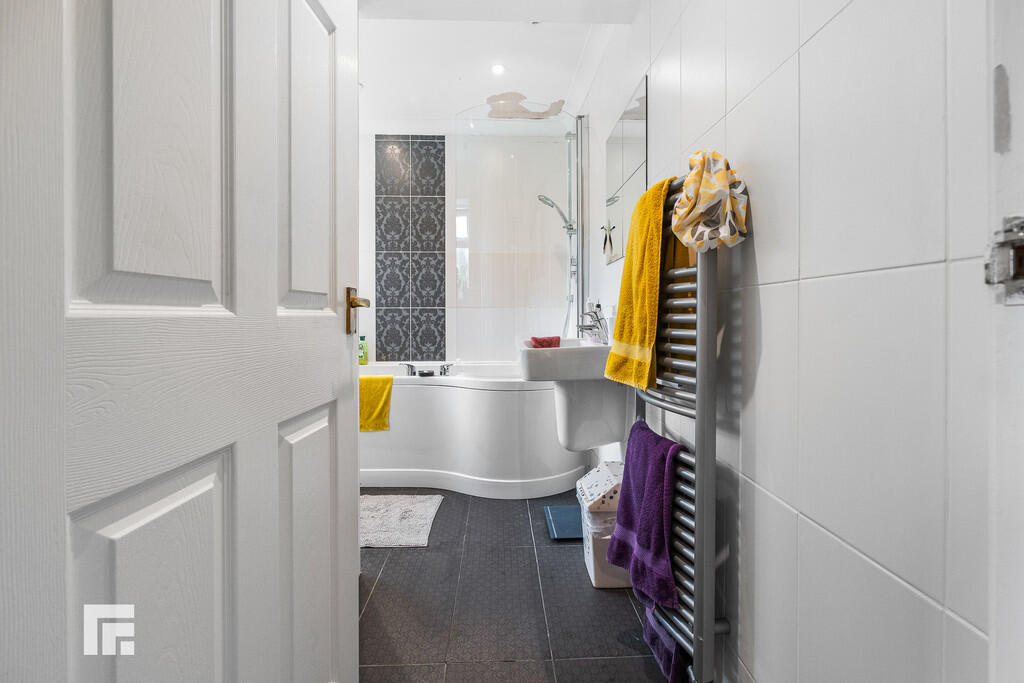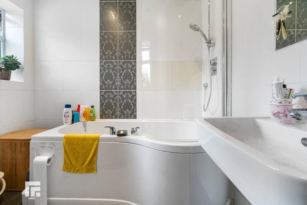 FAMILYBATHROOM Modern white suite comprising low level wc, wash hand basin, p-shaped bath with chrome shower above and glass swivel shower screen. Full wall tiling. Extractor fan. Heated towel rail.