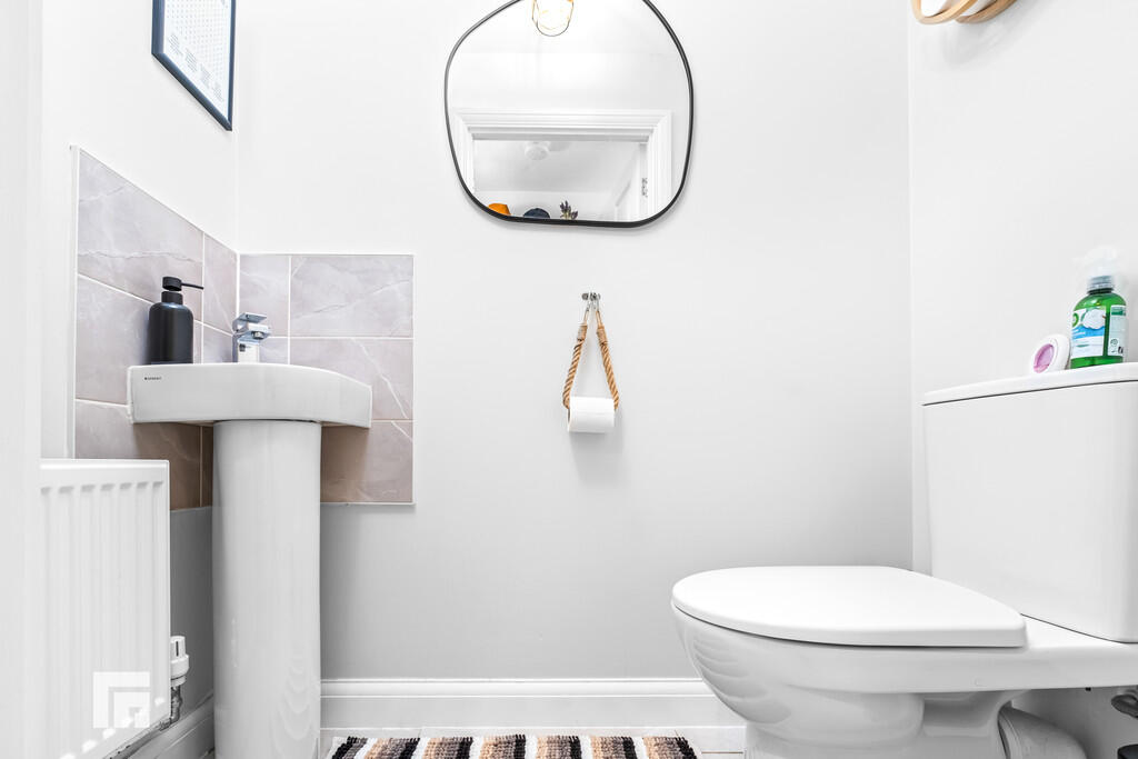 CLOAKROOM5' 4" x 2' 9" (1.64m x 0.85m) Modern white suite; low level WC with corner pedestal wash hand basin and chrome mixer tap. Extractor fan. Radiator. Tiled splashbacks and flooring.