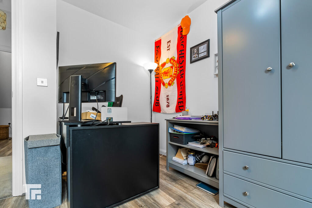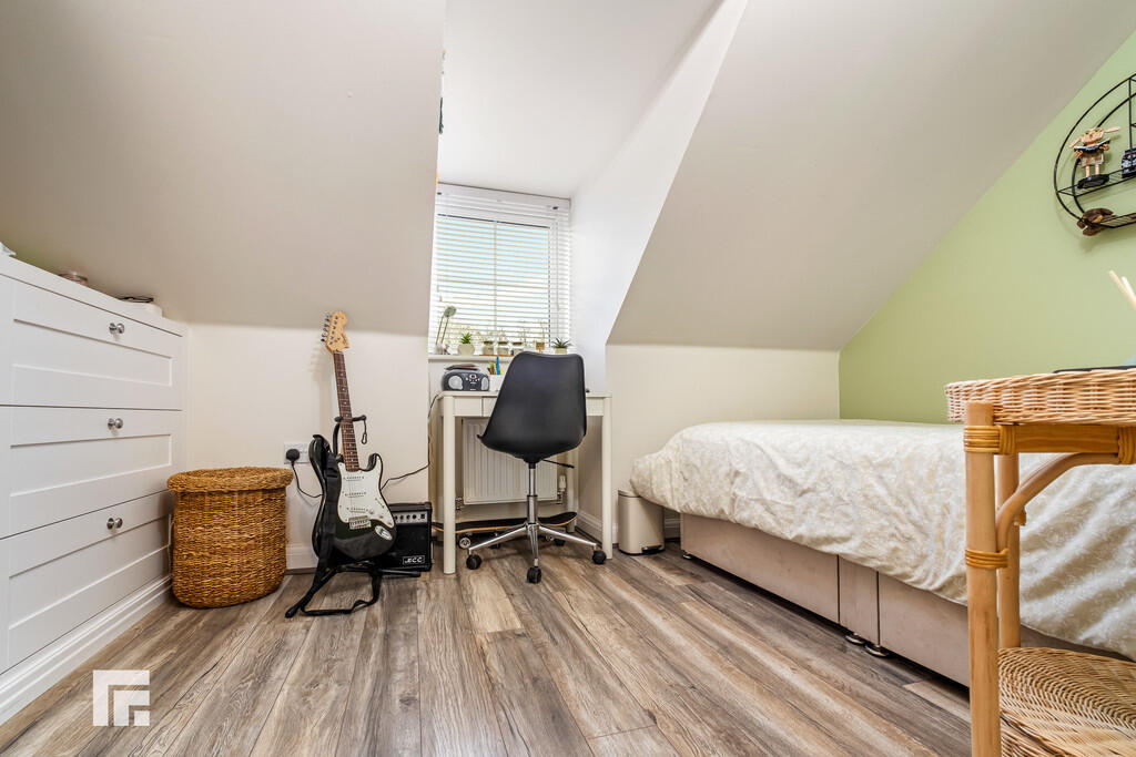 BEDROOMTHREE12' 9" x 8' 7" (max)(3.90m x 2.64m) A third double bedroom. Quality laminate flooring. Built in cupboard. Modern fitted wardrobe and chest of draws. Radiator. Dormer window to front.