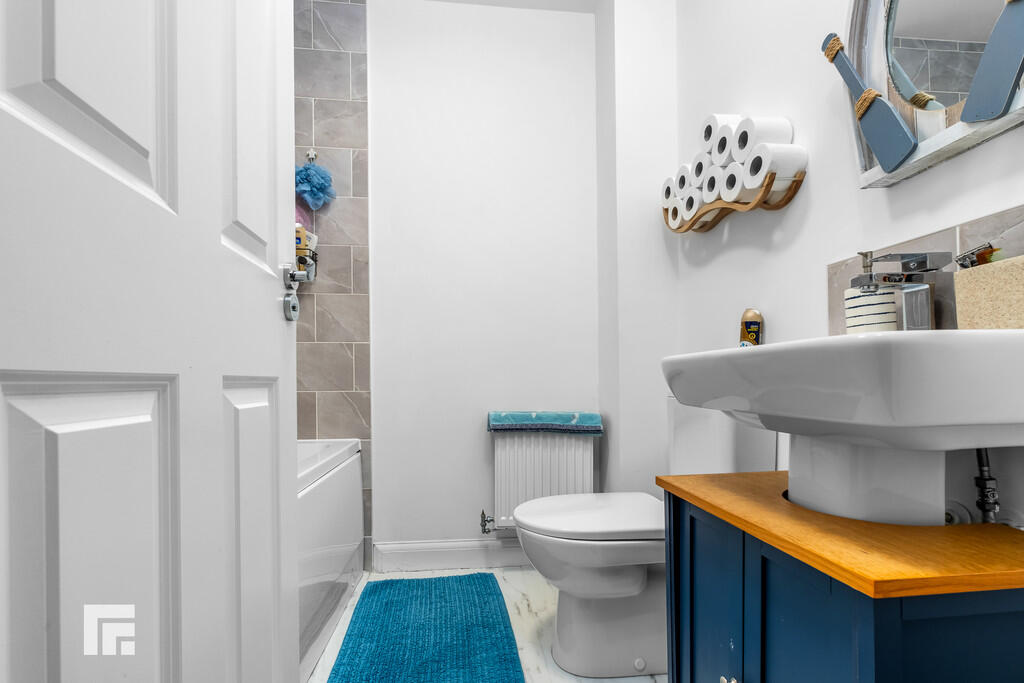 FAMILYBATHROOM6' 4" x 5' 6" (1.95m x 1.69m) Modern white suite; low level WC, pedestal wash hand basin with chrome mixer tap, bath with chrome mixer tap and chrome shower, tiled splashback. LVT flooring. Extractor fan. Radiator.