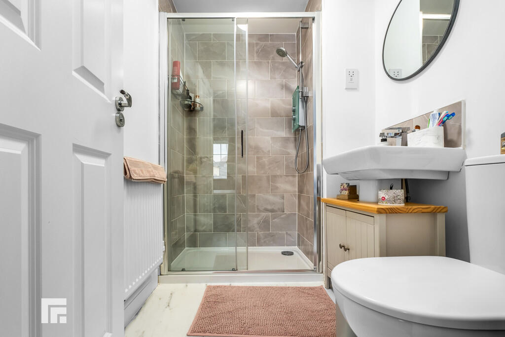 ENSUITE7' 0" x 5' 0" (2.15m x 1.54m) Modern white suite, low level WC, pedestal wash hand basin with chrome mixer tap, double shower cubicle with chrome shower and glass sliding doors, tiled splashbacks, radiator, extractor fan and shaving point. LVT flooring.