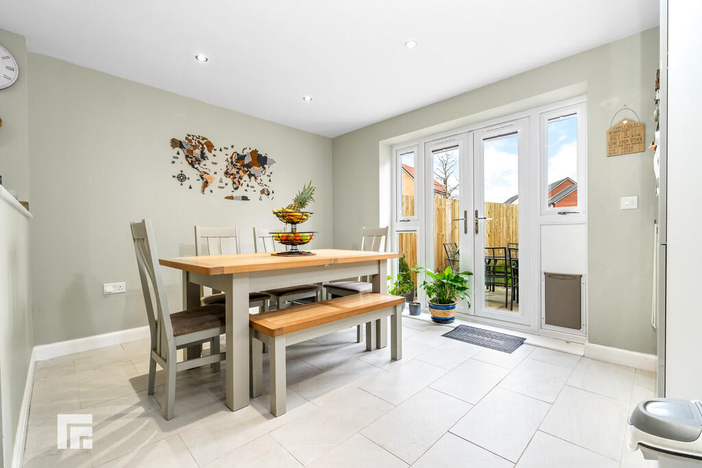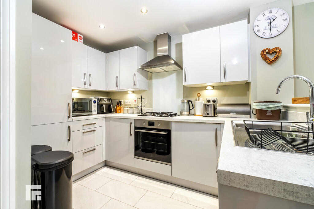 KITCHEN/DINER19' 11" x 12' 10" (6.09m x 3.92m) Appointed along three sides, eye and low level grey, gloss cupboards with chrome handles beneath quality laminate worktops. Stainless steel 1.5 bowl sink with drainer and chrome mixer tap, integrated four ring gas hob, extractor hood, integrated fridge/freezer, integrated dishwasher and integrated combined washer dryer. Ample space for dining room table and chairs. Understairs storage cupboard with socket and space for condenser tumble dryer. Tiled flooring. Spotlights. Double French doors with side windows opening into the rear garden.