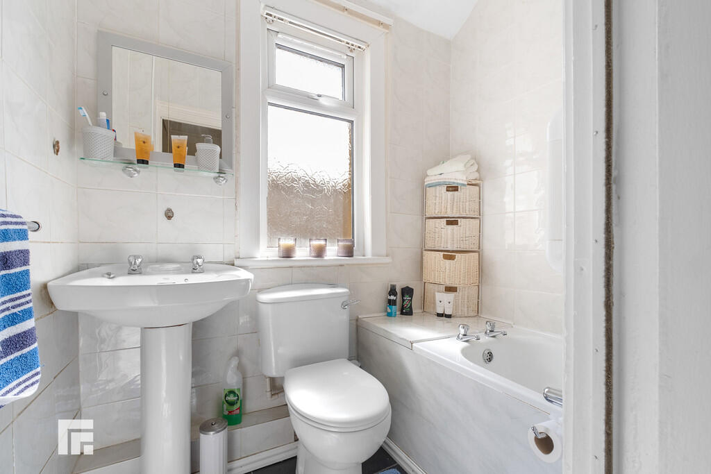 BATHROOM Tiled flooring and walls. White three-piece-suite comprising WC, pedestal wash hand basin with hot and cold tap over and panelled bath with hot and cold tap over and electric powered shower above. Pendant light fitting. Obscure double glazed uPVC window to side aspect.
