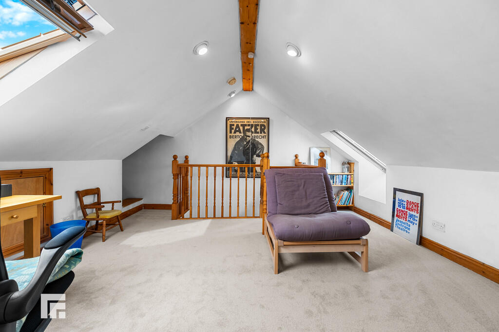 BEDROOMFOUR Compliant with building regulations to be used as a fourth bedroom. Two double glazed Velux windows to rear and front aspect. Carpet to floor. Eaves storage. Spotlights. Opening into additional storage area with spotlights.