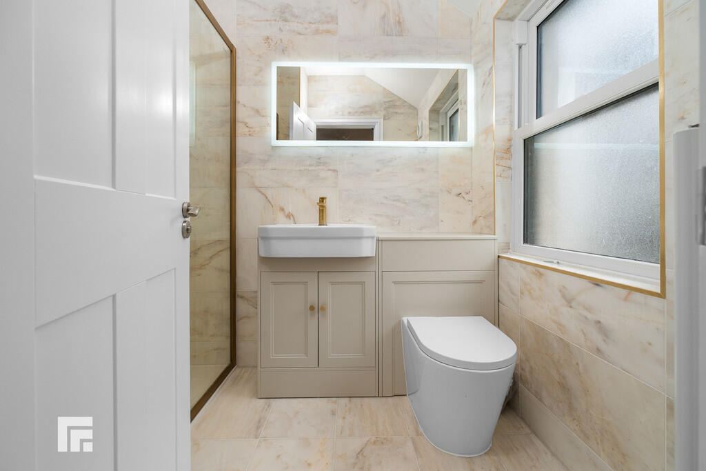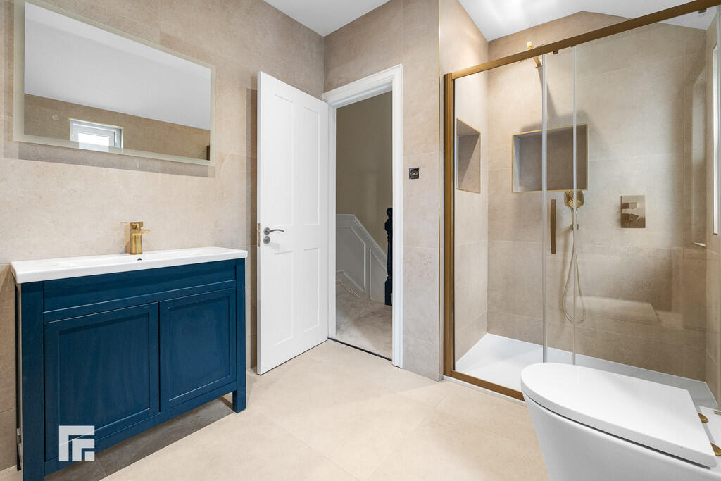 ENSUITE7' 3" x 4' 10" (2.23m x 1.49m) Mandarin Stone fully tiled walls and flooring. Double glazed obscure sash window to rear aspect. Walk in shower cubicle with mains powered shower over and additional handheld shower attachment. Vanity wash hand basin with mixer tap over and storage beneath, wall mounted vanity mirror over. WC. Heated towel rail. Spotlights. Shaver point.