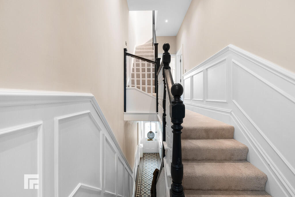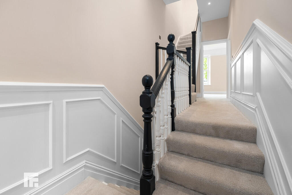 SECONDFLOOR Carpet to stairs. Spotlights. Door to bedroom four.