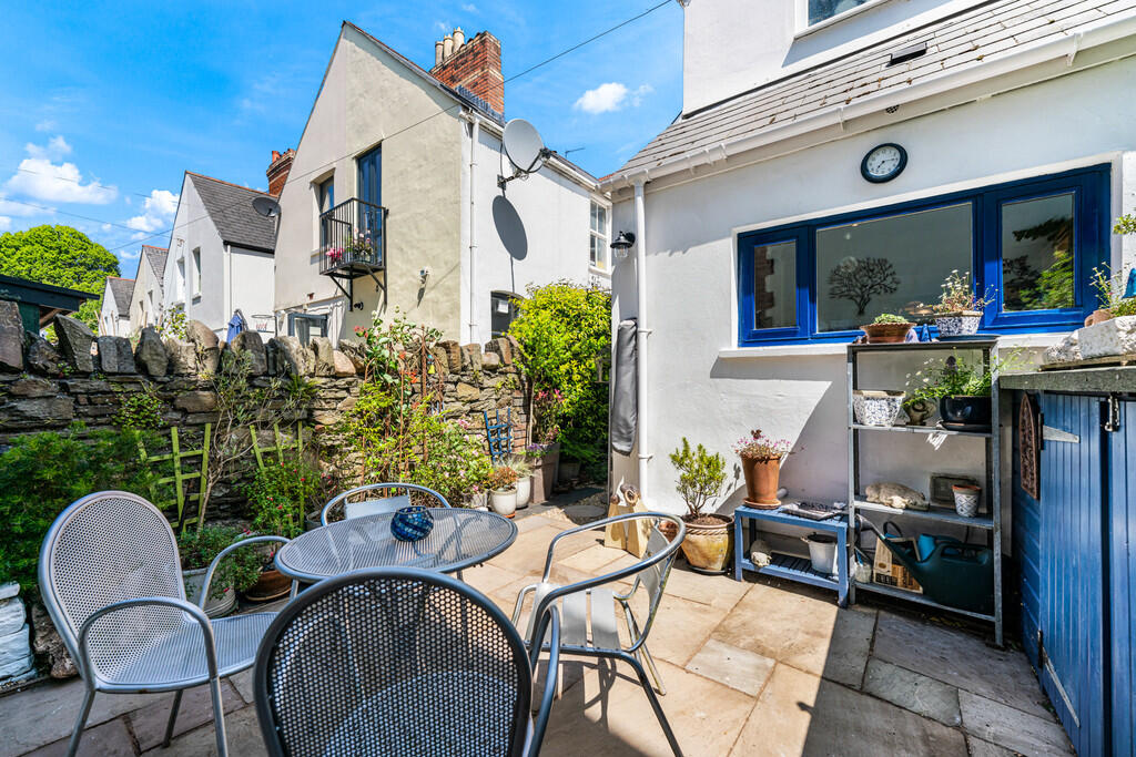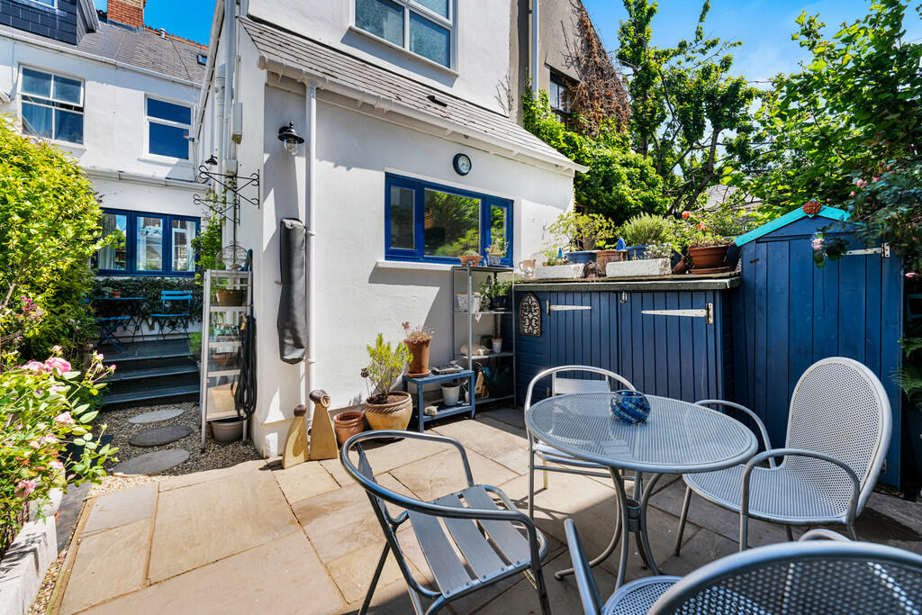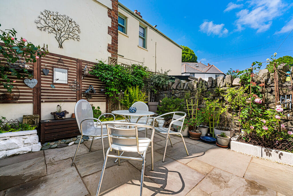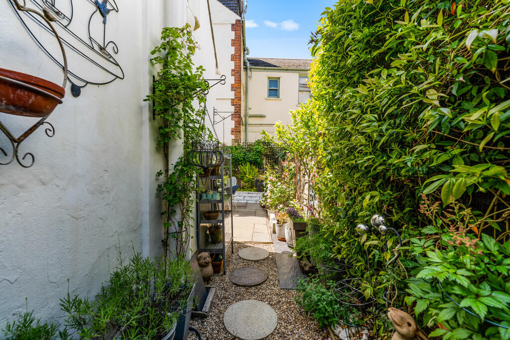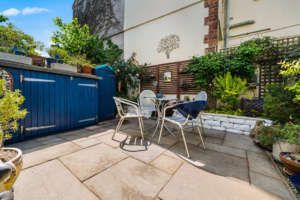 OUTSIDE Enclosed rear garden with paved patio area. Mature plants and some hedging.