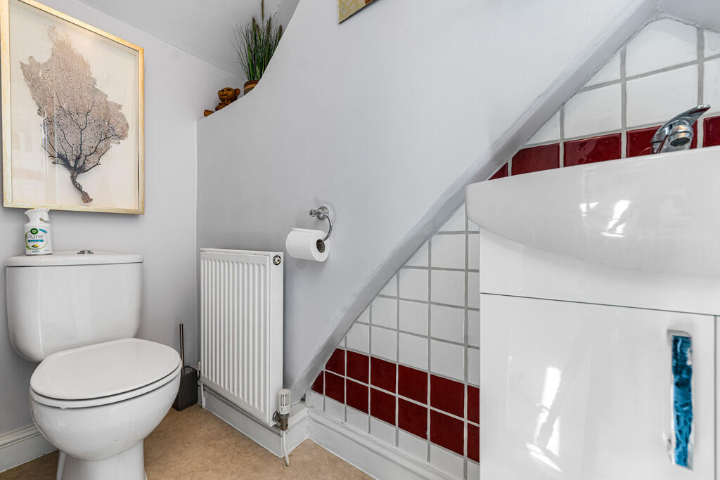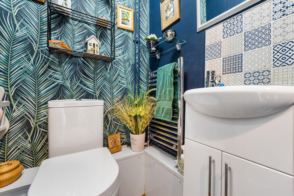 CLOAKROOM White suite comprising wash hand basin set in vanity unit and low level WC. Heated towel rail. Tiled splashbacks.