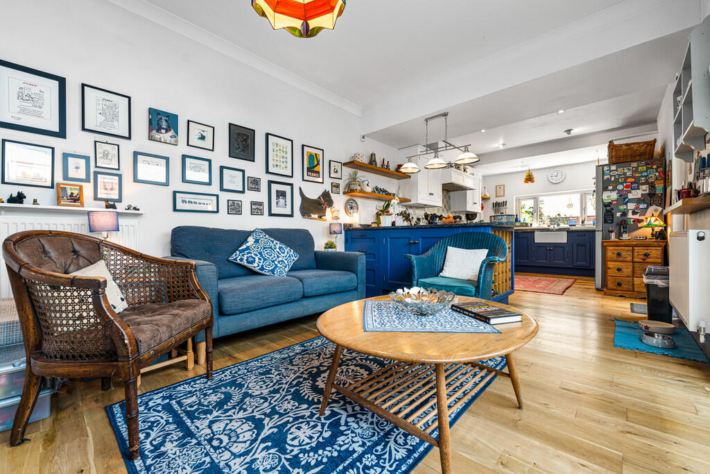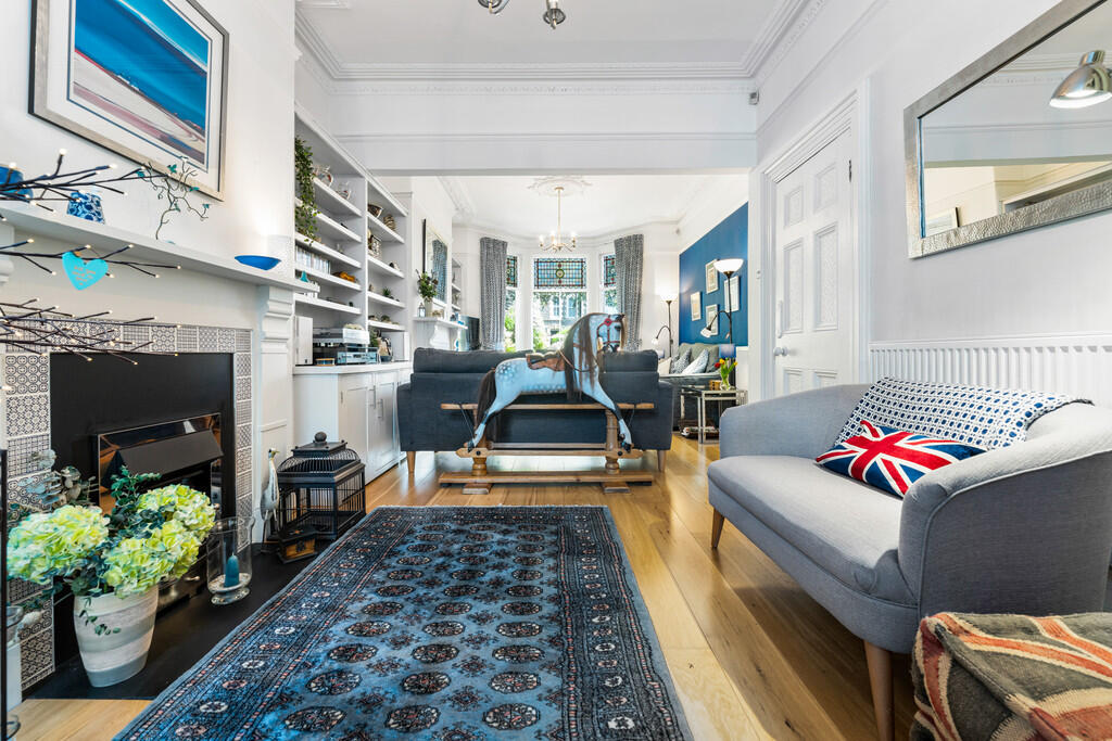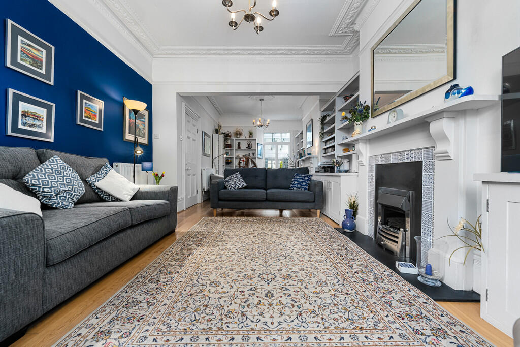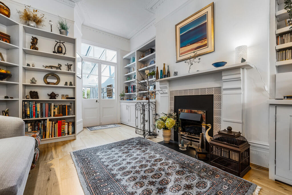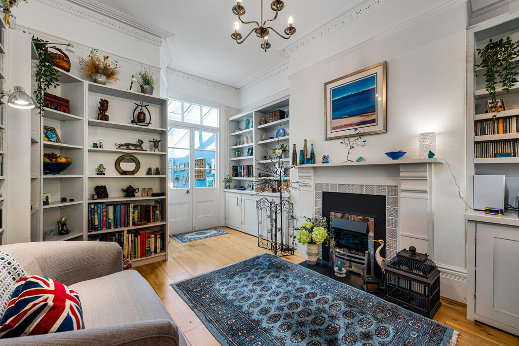LIVINGROOM15' 0" x 12' 1" (4.59m x 3.70m) Another lovely reception room with wooden flooring. Feature fireplace with inset fire. Deep skirting and ornate coving. Picture rail. Fitted cupboards and shelving to both alcoves. Half glazed doors opening into dining area.