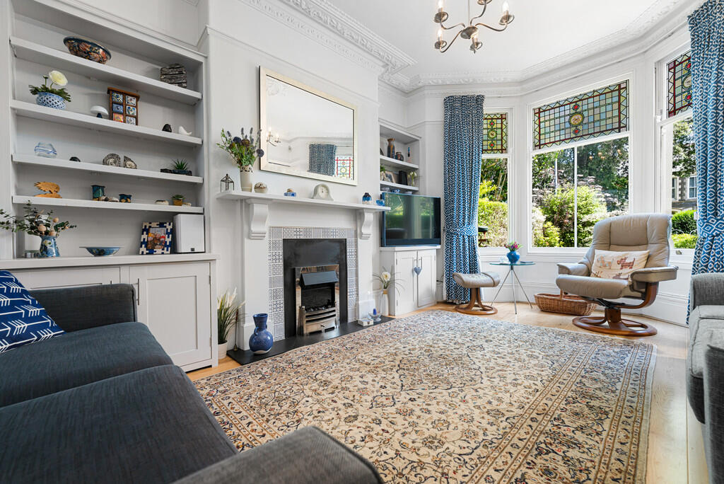 LOUNGE13' 11" x 13' 8" (4.25m x 4.18m) Bay window to front aspect with feature stained glass leaded lights. Feature fireplace with inset fire. Fitted cupboards and shelves to both alcoves. Wooden flooring. Ornate coving to ceiling. Deep skirting boards. Central heating radiator.