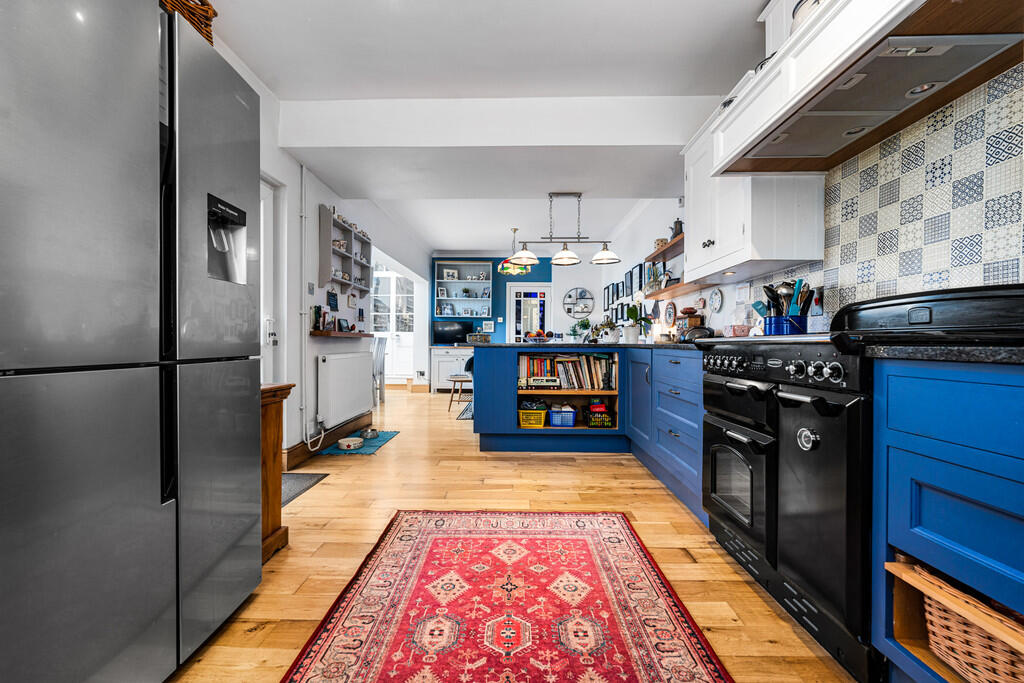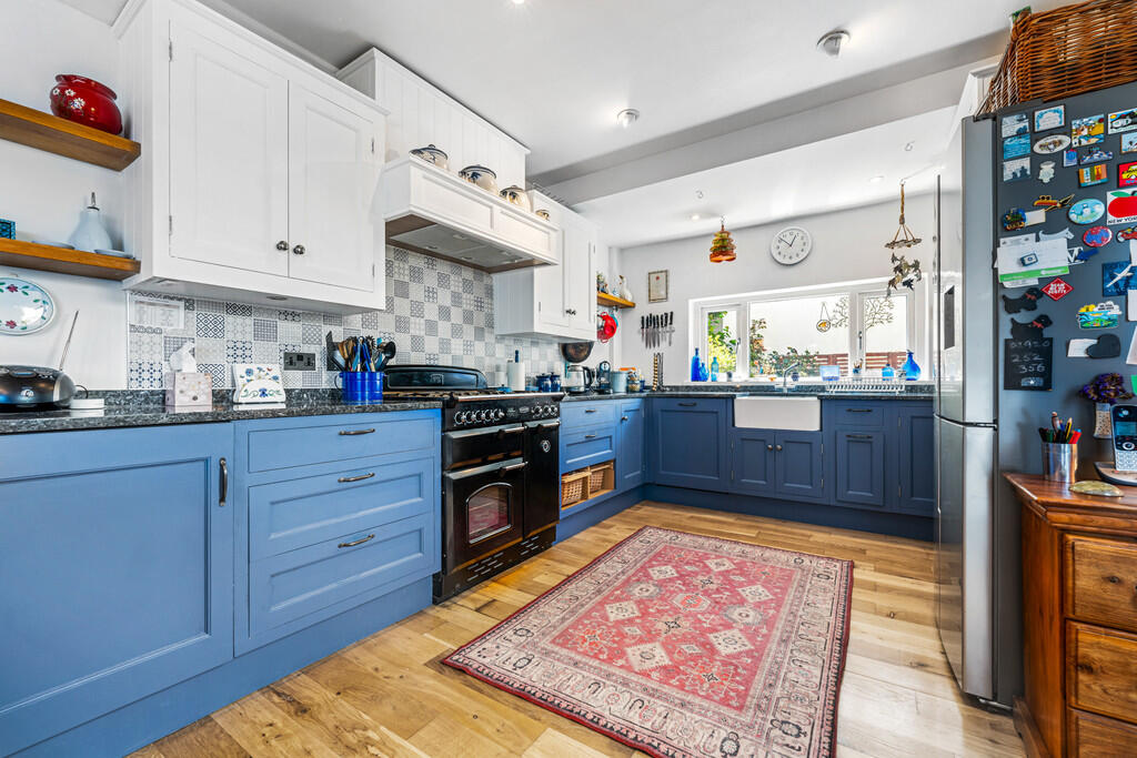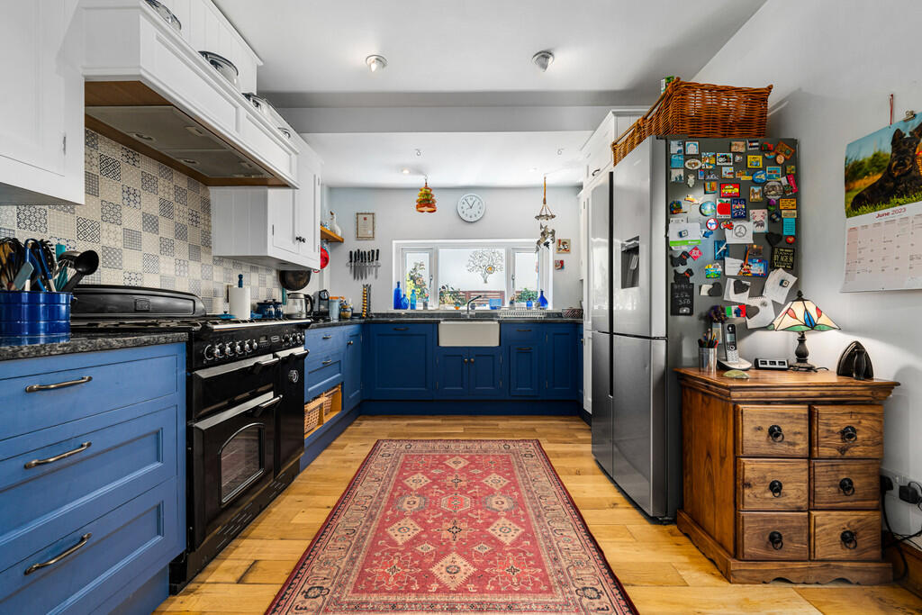 KITCHEN15' 4" x 10' 11" (4.67m x 3.33m) A well appointed kitchen fitted with a range of wall, base and drawer units with complementary work surfaces incorporating Belfast sink. Rangemaster cooker and American fridge freezer. Fitted washing machine and dishwasher. Tiled splashbacks. Wooden flooring. Wine rack. Central heating radiators.