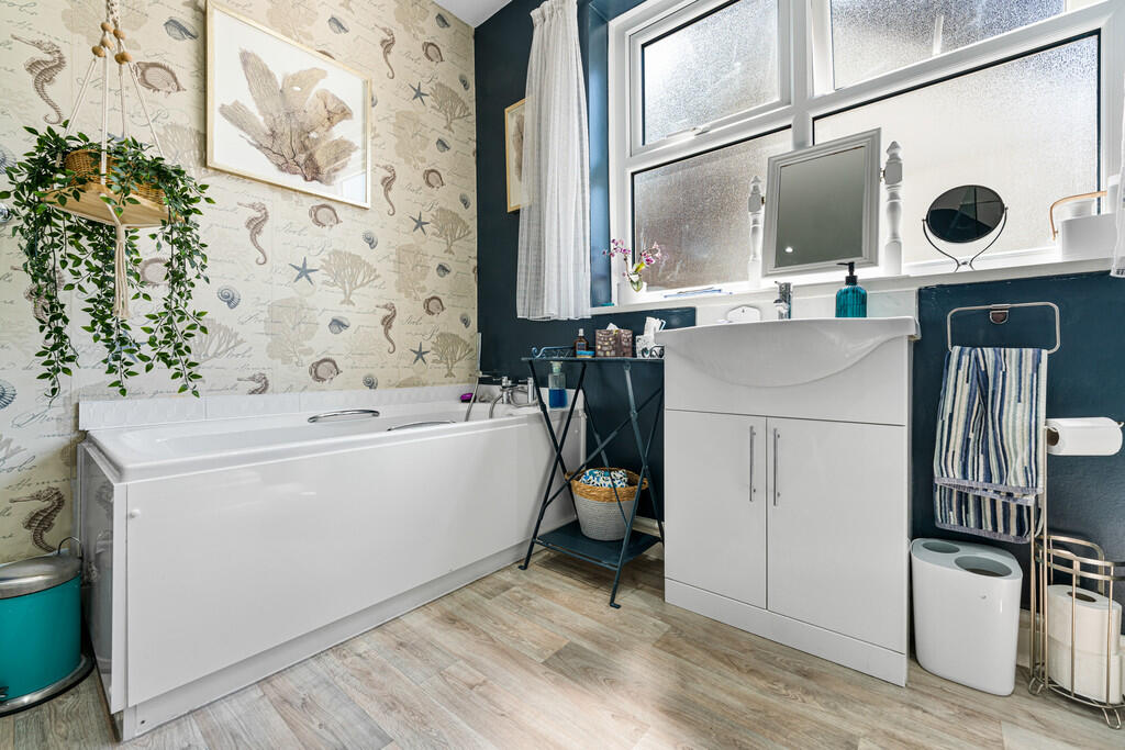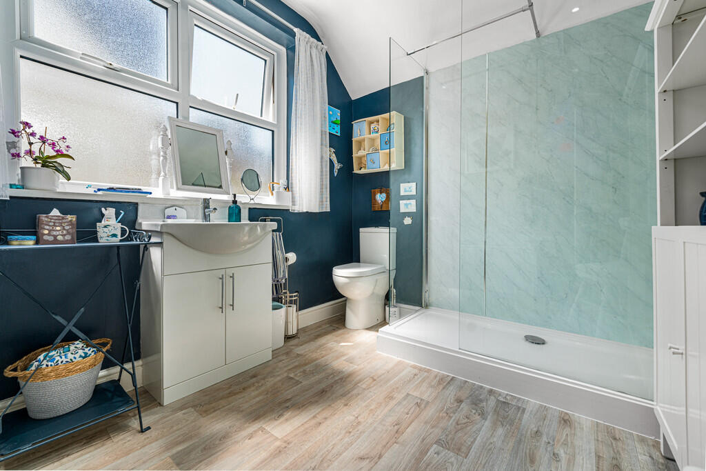 BATHROOM10' 11" x 8' 0" (3.34m x 2.44m) Obscure double glazed window to side. White suite comprising panelled bath, wash hand basin set in vanity unit and low level WC. Large walk in shower with glass screens. Wooden flooring. Inset spotlights to ceiling.