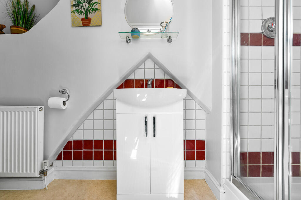 EN-SUITESHOWERROOM Fully tiled shower cubicle with mains shower and glass doors. White wash hand basin set in vanity unit and low level WC. Part tiled walls. Central heating radiator. Vinyl flooring.