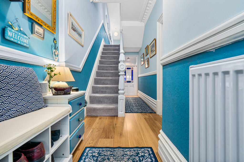 ENTRANCEHALL Wooden flooring. Deep skirting boards, original dado rail, ornate coving and architraves. Central heating radiator. Stairs to first floor with wooden balustrades. Door to cellar.