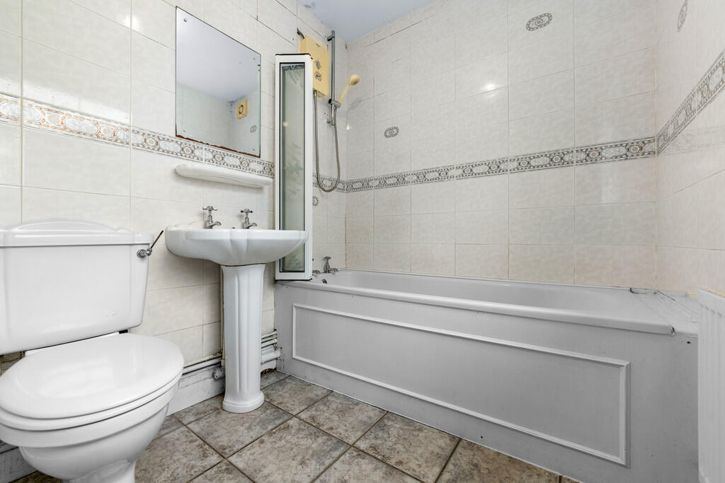 DOWNSTAIRSBATRHOOM8' 8" x 5' 4" (2.66m x 1.65m) Tiled flooring and walls. Obscure window to side aspect. White three-piece-suite comprising panelled bath with hot and cold tap over and electric shower above, pedestal wash hand basin with hot and cold tap over and WC. Radiator. Extractor fan.