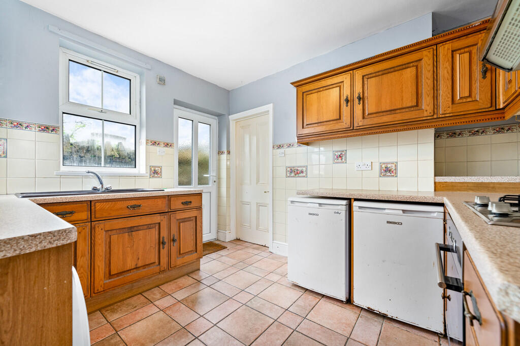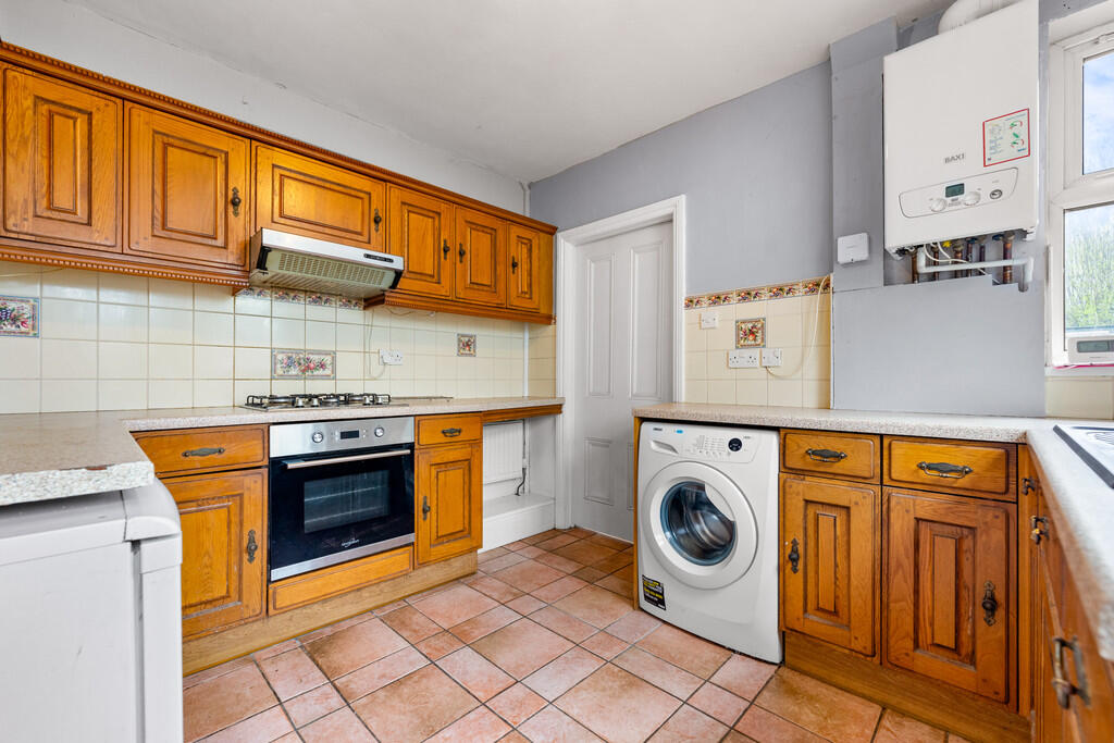 KITCHEN10' 0" x 8' 11" (3.06m x 2.74m) Tiled flooring and partially tiled walls. Range of wall, base and drawer units with round edged worktops over incorporating 1.5 sink with draining board and mixer tap over and four ring gas hob with extractor fan above and oven beneath. Space for appliances. Tiled splashbacks. Pendant light fitting. Wall mounted BAXI boiler. Two windows to side aspect. Door leading to rear garden. Radiator. Power points. Door leading to downstairs bathroom.