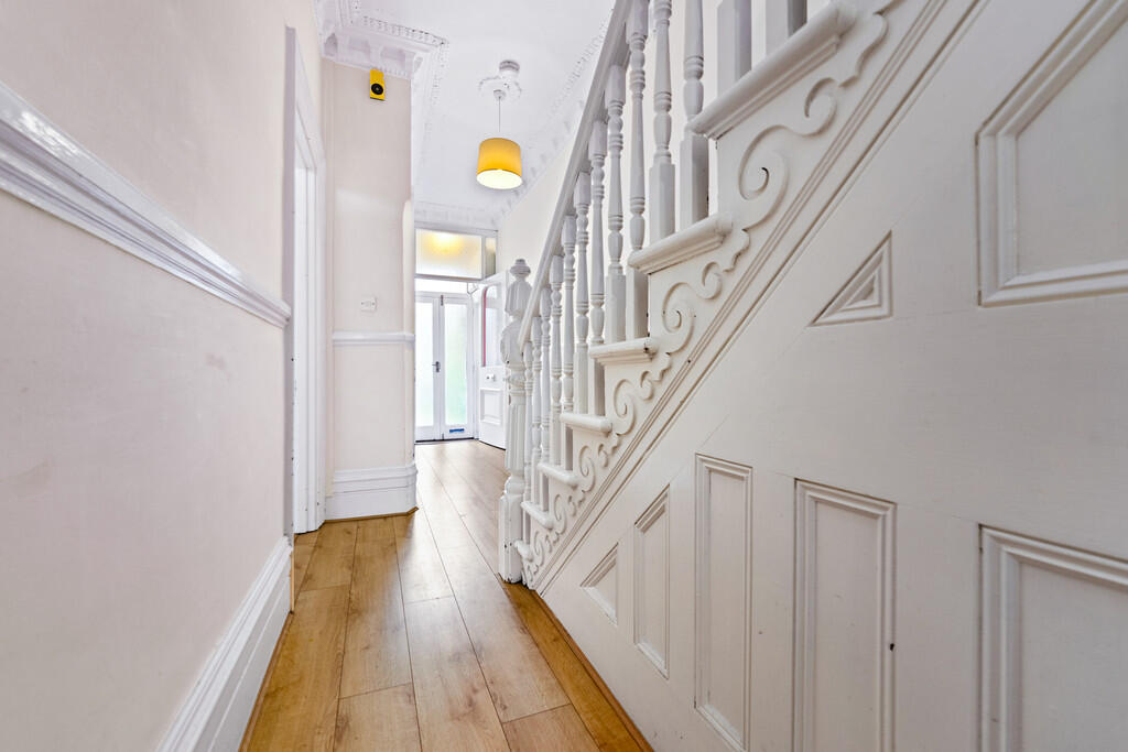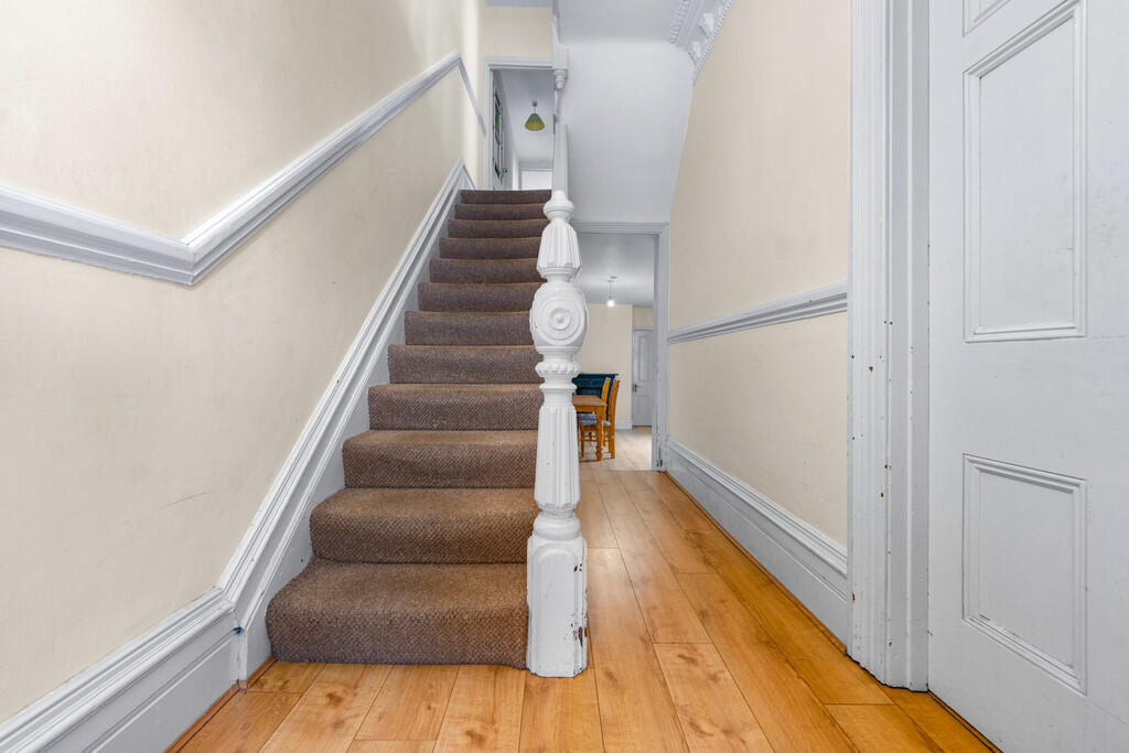 ENTRANCEHALL Laminate flooring. Dado rail. Radiator. Original coving to ceiling. Pendant light fitting with ceiling rose. Power points. Doors to three reception rooms. Stairs to first floor.