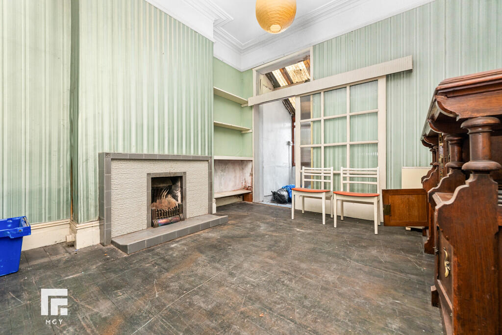 SITTINGROOM12' 3" x 11' 5" (3.74m x 3.48m) Wooden floorboards. Pendant light fitting. Two alcoves. Feature fireplace. Radiator. Power points. Door leading to lean-to which is perfect for storage / has potential to make a great downstairs WC. Door leading to rear garden.