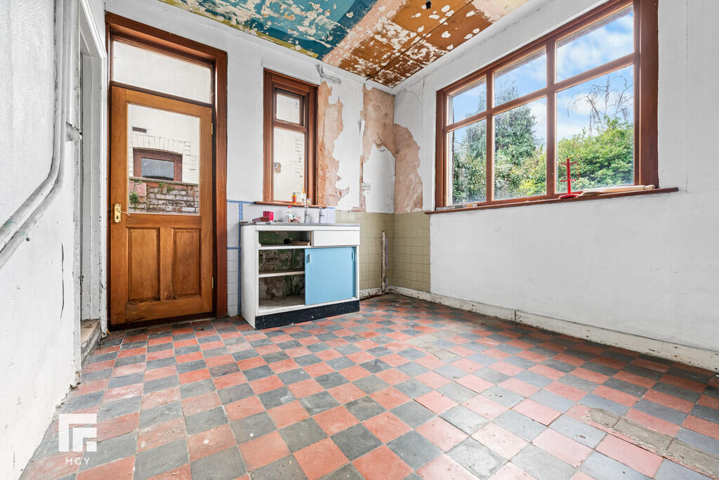 KITCHEN12' 2" x 10' 1" (3.73m x 3.08m) Tiled flooring. Pendant light fitting. Stainless steel sink with hot and cold tap over and storage beneath. Partially tiled walls. Two double glazed windows to rear aspect. Double glazed door leading to rear garden.