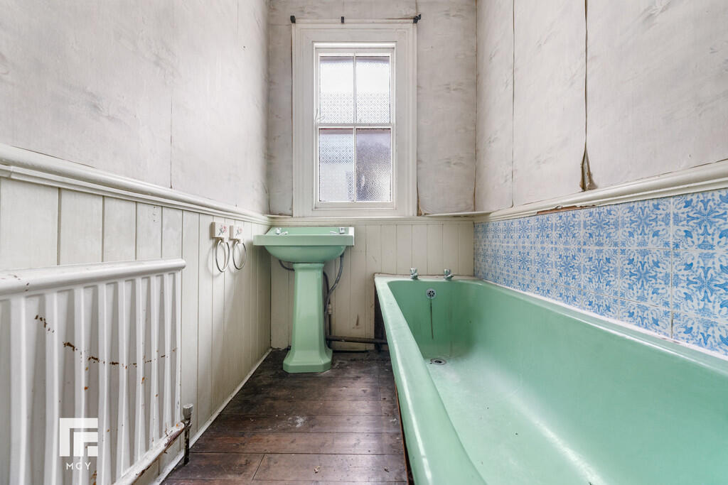 BATHROOM8' 9" x 7' 1" (2.67m x 2.16m) Continuation of floorboards from hallway. Obscure window to side aspect. Pedestal wash hand basin with hot and cold tap over. Panelled bath with hot and cold tap over. Partially tiled walls. Pendant light fitting.