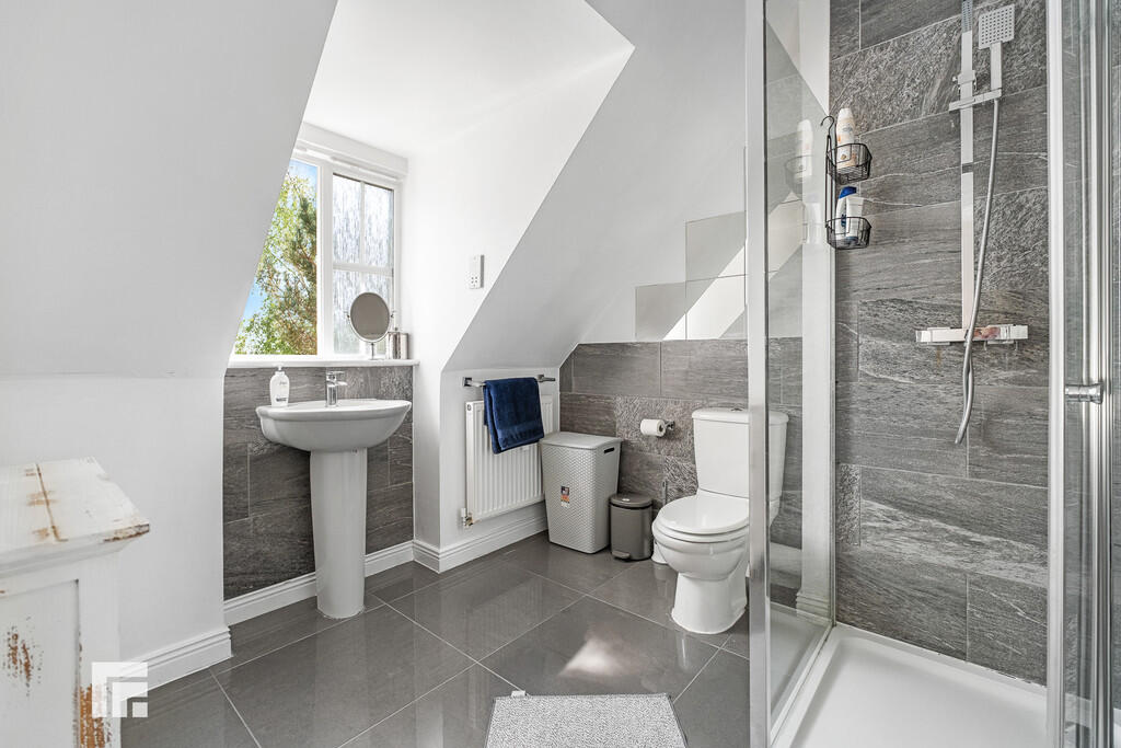 ENSUITE8' 1" x 8' 5" (2.481 m x 2.581m) uPVC obscure double glazed window to rear. Part tiled walls. Shower cubicle. WC. Wash hand basin.