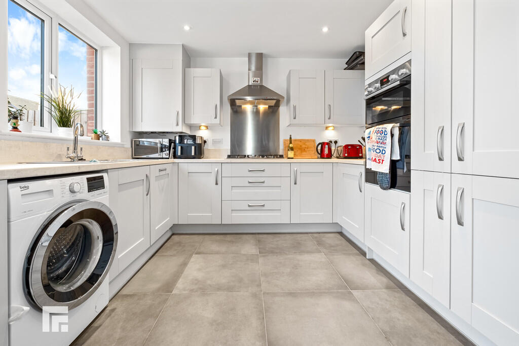 KITCHEN/DINER16' 3" x 9' 10" (4.96m x 3.00m) Double glazed French doors to front, with access to rear garden. Modern fitted kitchen across three walls with under unit lighting and worktops over incorporating stainless steel 1.5 sink with mixer tap over, plus five ring gas hob with extractor hood above. Integrated Bosch electric oven and grill. Integrated appliances such as fridge/freezer and dishwasher. Space and plumbing for washing machine. Radiator. Continuation of tiled flooring from hallway. TV point.