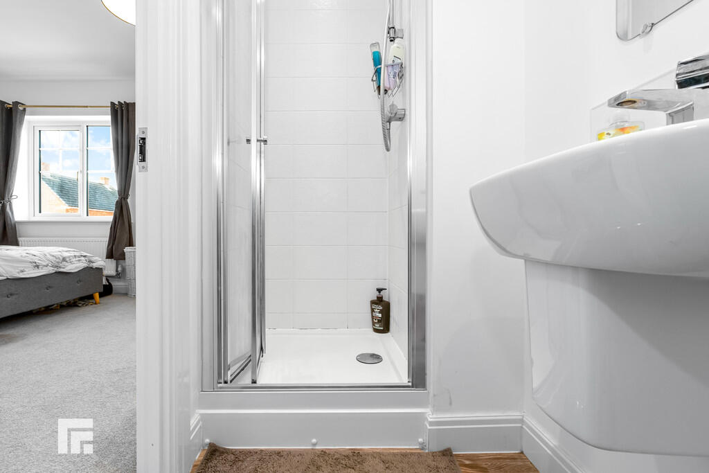 ENSUITE8' 11" x 3' 2" (2.74m x 0.98m) Excellent modern suite comprising: walk in shower cubicle, with folding glass door and mains shower with tiled splashbacks, plus contemporary wall mounted wash hand basin with mixer tap over. W.C. LVT flooring. Part tiled walls. Heated towel rail. Extractor fan.