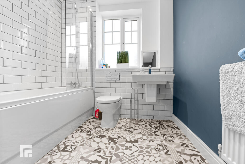 BATHROOM7' 0" x 8' 4" (2.14max x 2.56max) White three-piece-suite comprising panelled bath with mixer tap over and rainfall mains shower head above, wall mounted wash hand basin with mixer tap over, and WC. LVT flooring and partly tiled walls. Radiator. Spotlights.