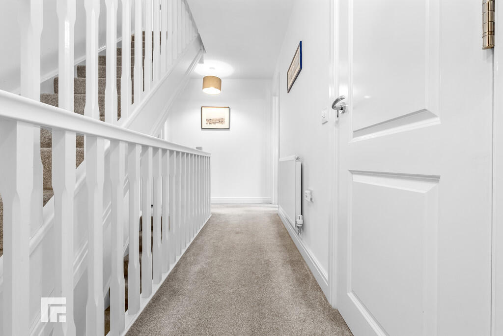 FIRSTFLOORLANDING Carpeted stairs and landing. Doors to two bedrooms and family bathroom. Pendant lighting. Stairs rising to second floor. Door to storage cupboard.
