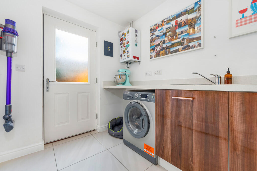 UTILITYROOM7' 10" x 6' 7" (2.39m x 2.03m) Continuation of high gloss units with complimentary work surfaces incorporating stainless steel sink unit and mixer tap. Obscure glazed door leading to rear garden and internal door to garage. Wall mounted boiler. Tiled flooring.