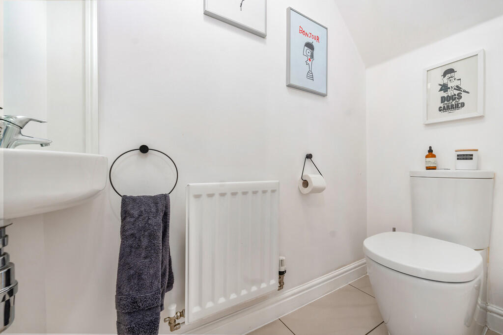 CLOAKROOM Low level WC and corner wash hand basin with mixer tap. Tiled floor. Extractor fan. Radiator.